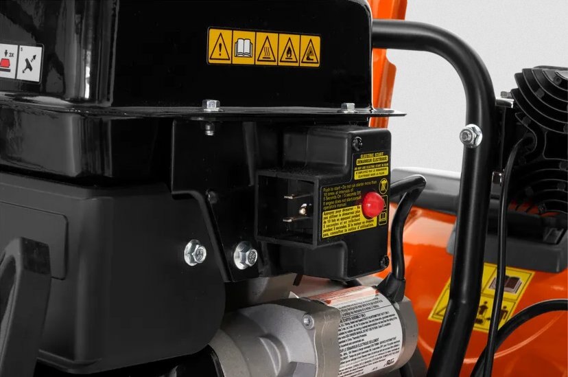 Connect to a power outlet and start the engine by pressing a button. When the engine is warm, it's easy to get going with the starter handle. |