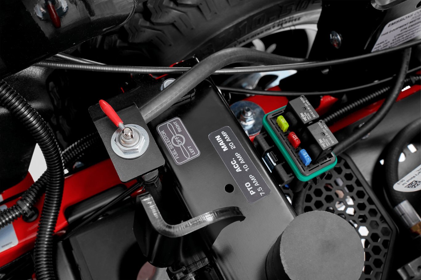 Dual fuel tanks with 10 gallon total capacity allows for all day running. Oversized fuel caps reduce spillage. |