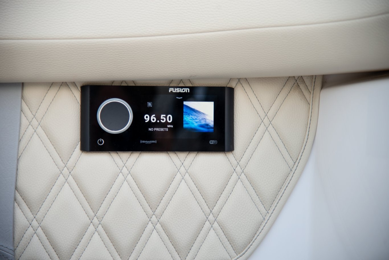 The helm is complete with a hand-wrapped vinyl steering wheel complimented by the diamond stitching alongside the dash. The one-piece, stainless steel curved-windshield is custom built to seamlessly wrap the dash of the LS4C.