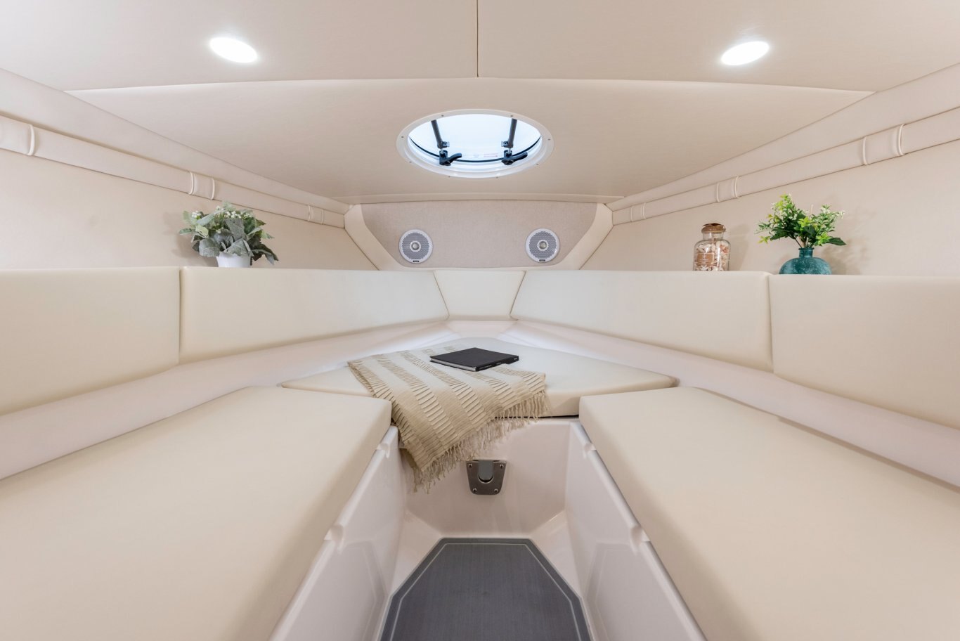 The cabin offers maximum versatility with ample storage space found underneath each seat cushion and the ability to transform into a berth by simply adding a center filler cushion.