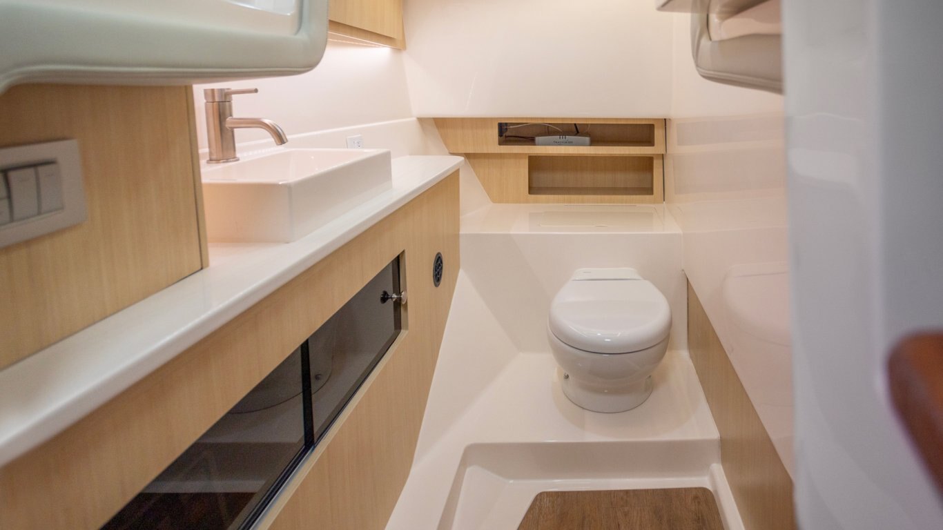 Conveniently access the spacious head compartment with the power sliding feature, adding ease and comfort to your boating experience. |