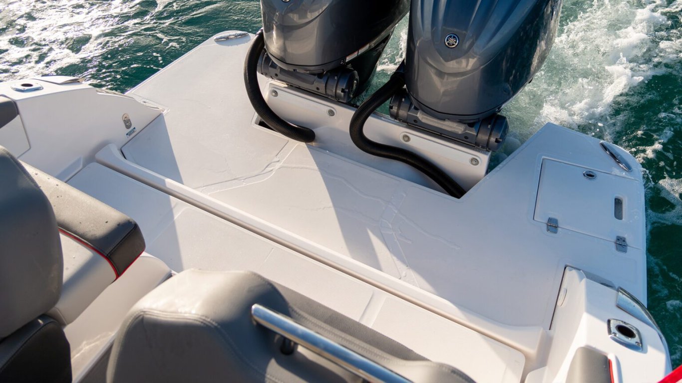 The LX9's swim platform is massive, wraps around the outboards, and is right at the water line.