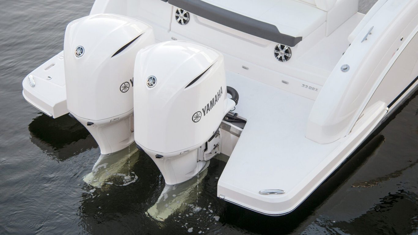 A massive swim platform wraps around outboards and sits low to the water for easy boarding and water access. |