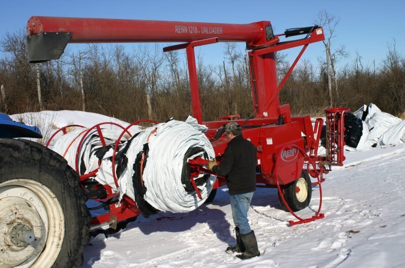 Superior Plastic ManagementThe RENN Onboard Recycle-Ready Plastic Management System uses RENN’s unique hydraulic ratchet system to wind the spent bag onto rear rewind spools, keeping the plastic clean for recycling. Once unloading is complete, the plastic is rewound into a recycle-ready package, which slides easily off the collapsible rewind spool. Operators appreciate the time savings and simplicity of this grain bag windup system. The RGU 1218 CD Grain Bag Unloader has been designed to carry and process an entire 12’ x 500’ grain bag. Switching from transport to operating mode is a simple task requiring minimum effort and no tools; the operator just backs into the grain bag and lowers the machine. Designed and built to operate in Western Canada’s harshest field and weather conditions, RENN Unloaders allow farmers to empty a grain bag anywhere, at any time, efficiently and with minimal effort. |