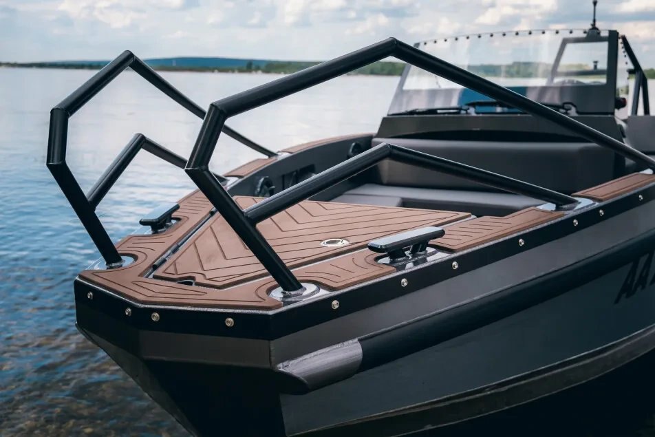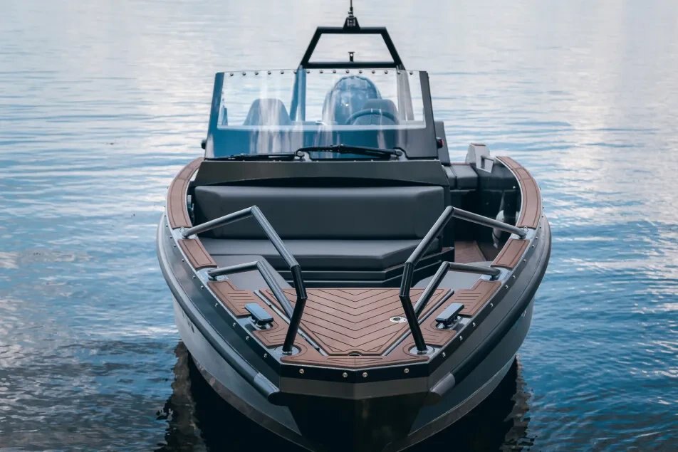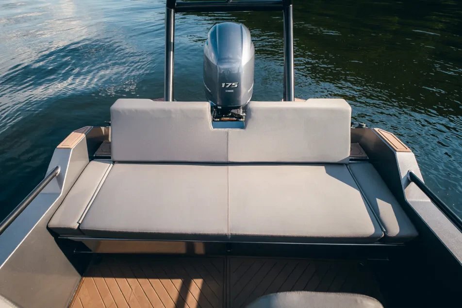 EXTERIOR EQUIPMENT Aft swimming platforms Aluminum 5083 Body thickness bottom/side (4/4 mm) Brackets for emergency towing and fixing to the trailer Brackets for mounting transom plates and navigation sensors Buoyancy blocks EVA deck Fender hooks Hull soundproofing Integrated aft ladder Power frame PVC fenders Railing Self-draining deck Tempered console glass (8 mm) Vinyl coated sides (default color gray) Welded cleats (x4)