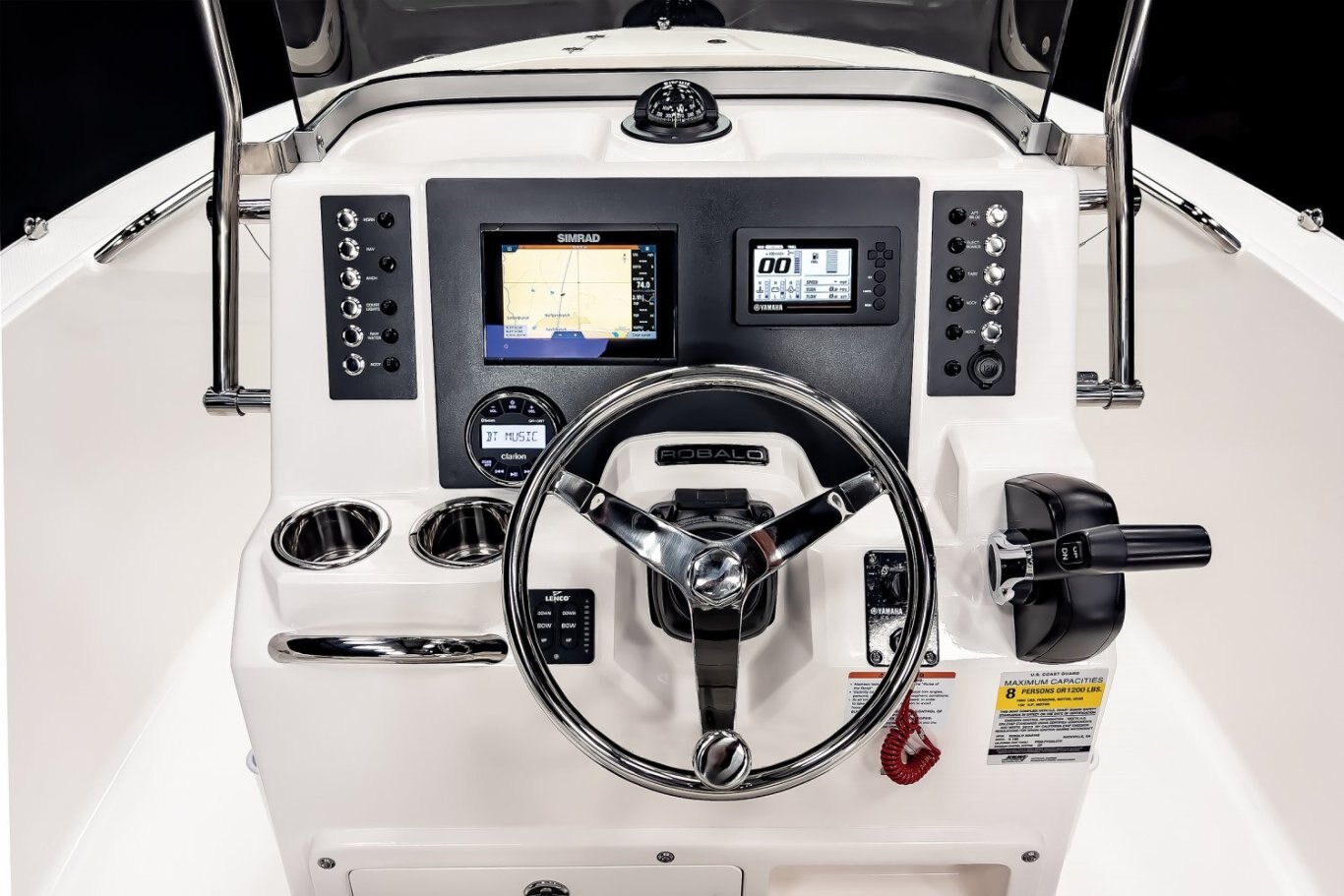 12V DC Receptacle on Dash 12V Wiring Buss Inside Console Aluminum Panel with Weatherproof Stainless Steel Round Switches and Circuit Breakers Battery On-Off Switch BayStar Hydraulic Steering Bilge Pump with Automatic Switch Digital Gauges Electrical Connectors Triple O-Ring Sealed and Water Tight Lighted Compass Navigation Lights - LED Stainless Steel Steering Wheel Stereo System - AM/FM Radio with Bluetooth and Water Resistant Speakers (4), with Blue LED Lighting Tinned Copper Wiring with Waterproof Connectors