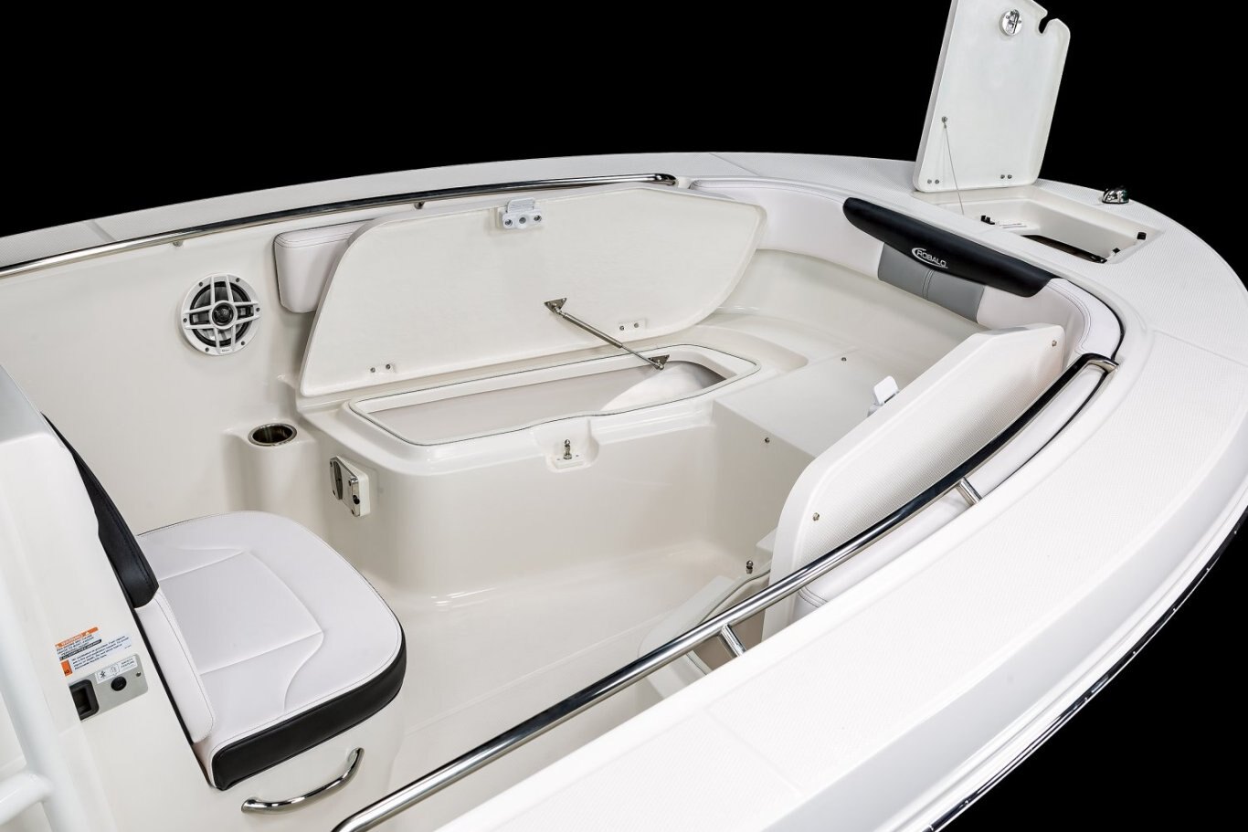 Access into Console from Forward Side Aluminum Framed Acrylic Windshield With Stainless Steel Grab Rail Fiberglass Console Door - Friction Hinged and Lockable Forward Console Seat and Bolster Integrated Footrest in Console with Storage Stainless Steel Drink Holders (2) Stainless Steel Grab Rails Storage on Top of Console with Drains Vertical Rod Storage (6)