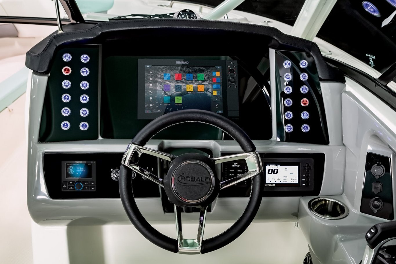 Black Leather Wrapped Steering Wheel with Robalo Logo Dual Color LED Underwater Lights (2 each) JL Audio Sound System Upgrade Simrad B175 1KW Transducer Simrad NSS16 EVO3S Chartplotter Multifunction Display Simrad Radar Halo Open Array with GS25 Heading Sensor VHF Radio