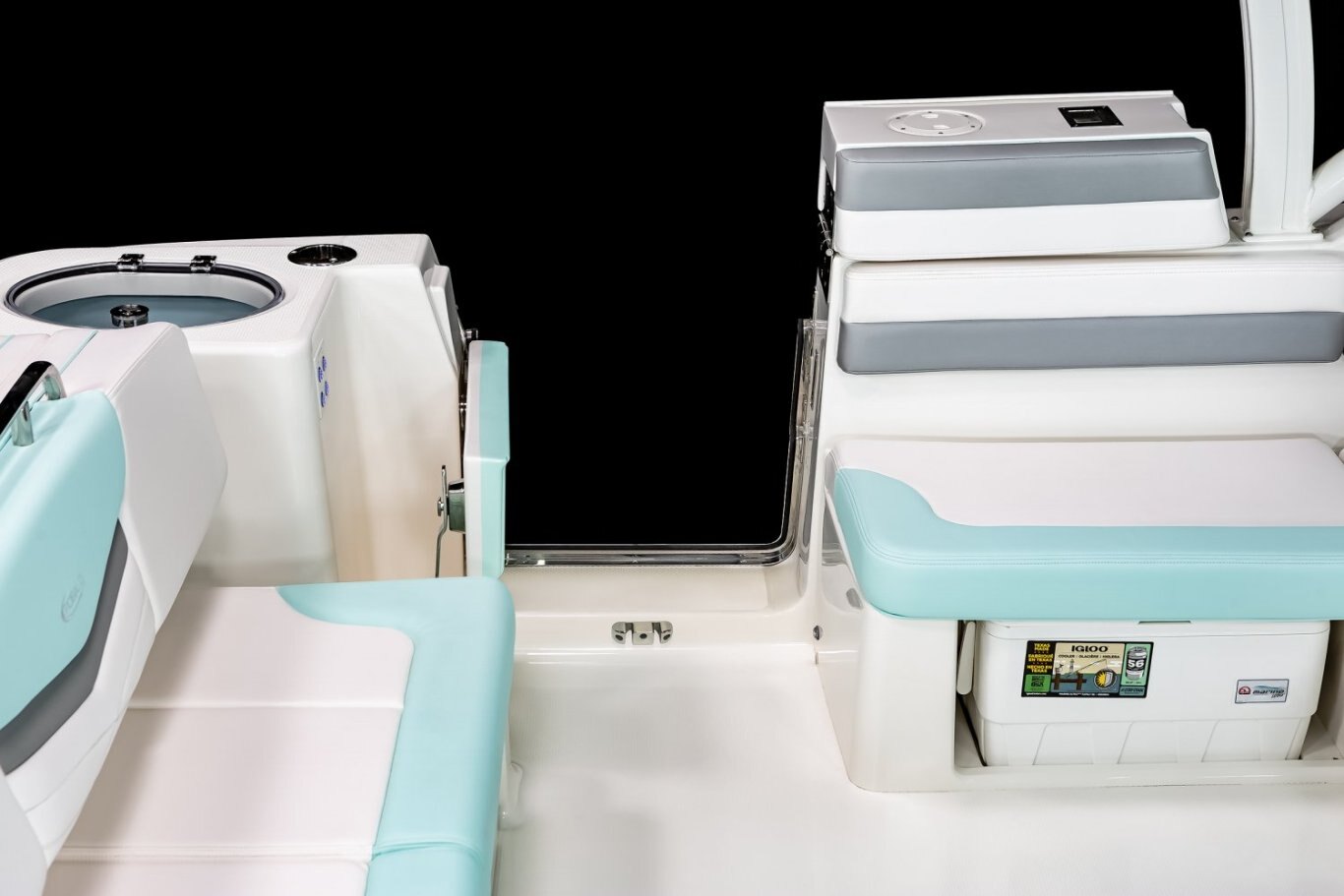 Self Bailing Cockpit with Integrated Drain Fittings Stainless Steel Cockpit Grab Rails Stainless Steel Drink / Rod Holders in Gunnel (2) Stainless Steel Drink Holders - Bow (4) and Cockpit (12) Stainless Steel Friction Hinges on Molded Hatches Stainless Steel Rod Holders Mounted in the Deck Gunnel (2) Stainless Steel Toe Rail Vista-View Lounge Seat with Reclining Backrests Converts into Sun Lounger with Molded Cooler/Fish Box Underneath and Overboard Drain Walk Thru Transom Door