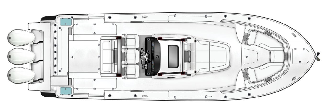 80 Gallon In-Floor Cockpit Fish Boxes Port and Starboard with Overboard Discharge Pumps Aft Facing Bench Seat with Stainless Steel Drink Holders and Removable Tackle Box Storage Battery Switch Panel Mounted in Helm Seat Base Bow Cushions - Removable Bow Floor Storage with Fiberglass Lid Carry-On Cooler (Yeti) under Aft Facing Seat (65 Quart) (not available with Wetbar Option) Cockpit and Bow Coaming Bolsters Cockpit Courtesy Lights - Blue LED Cockpit Table with Dedicated Storage Diamond Lustre Non-Skid Surfaces Full Transom Seat Folds Flush into Transom Wall with Fiberglass Cover Hatch Interior Color Packages: Harbor Black, Harbor Blue, Harbor Gray, Harbor Ice Blue, Harbor Seafoam Green, Harbor Steel Blue, Harbor Mist, Shadow, Sand or Cayenne Large Port and Starboard Side Rod Storage Compartments with Lockable Fiberglass Lids Molded Bow Storage Compartments with Solid Surface Countertops, Three Drawer Storage and Trash Receptacle Molded Storage Compartments Under Port and Starboard Bow Deck Hatches Port and Starboard Cockpit Side Entry Door with Custom Stainless Steel Frame and Hardware Premium Stain Resistant Silicone Cockpit Fabric Self-Bailing Cockpit with Overboard Drain System Stainless Steel Drink/Rod Holders in Gunnel (4) Stainless Steel Drink/Rod Holders On Aft Cockpit Wall (2) Stainless Steel Friction Hinges on Bow Deck Hatches Stainless Steel Rod Holders across the Transom Wall (8) Stainless Steel Rod Holders in Port and Starboard Gunnel (6) Three Forward Facing Helm Seats with Flip-Up Bolsters and Folding Armrests (Includes Center Electric Forward/Aft Controls) Twin Aft Insulated Livewells (30 Gallons) with Specific Livewell Pumps, LED Lighting, Blue Gelcoat Finish, Adjustable Flow Valves and Clear Plexiglass Lids Walk Through Transom Door is Flush Mounted