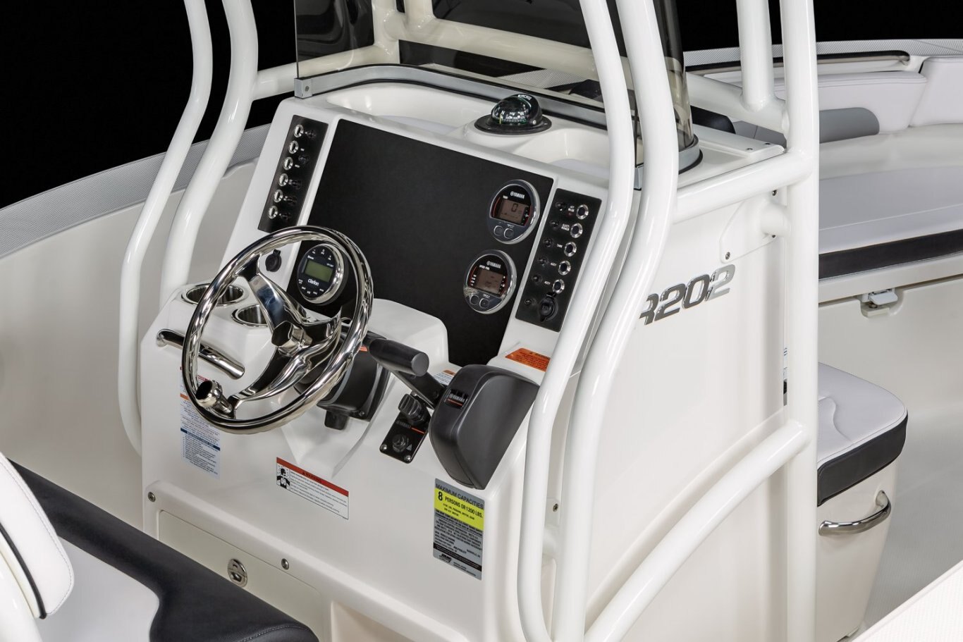 Standard Features 12V DC Receptacle on Dash 12V Wiring Buss inside Console Aluminum Panel with Weatherproof Stainless Steel Round Switches and Circuit Breakers Battery On/Off Switch Bilge Pump with Automatic Switch Digital Gauges Electric Horn Electrical Connectors Triple O-Ring Sealed and Water Tight Lighted Compass Navigation Lights - LED Owner's Dry Bag Seastar Hydraulic Steering Stainless Steel Steering Wheel with Control Knob Stereo System - AM/FM Radio with Bluetooth and Water Resistant Speakers (4), with Blue LED Lighting Tinned Copper Wiring with Waterproof Connectors