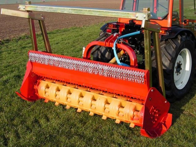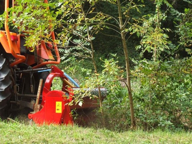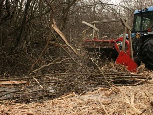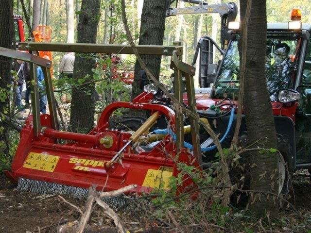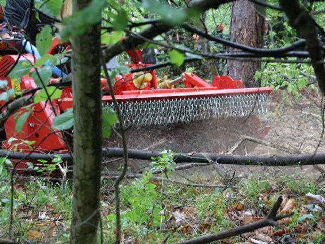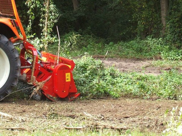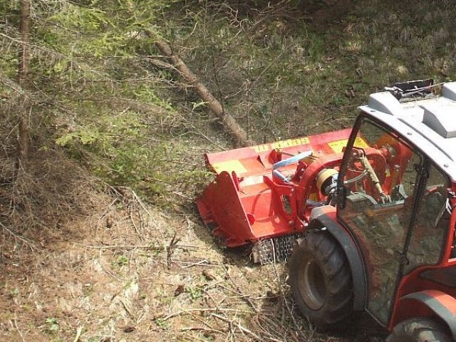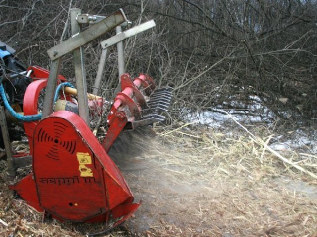 The brush cutter MINIFORST may be fitted to small and medium horse power tractors. It mulches brush and wood up to 12 cm [4.8”] in diameter with ease! The hydraulic hood controls the degree of mulch.