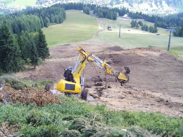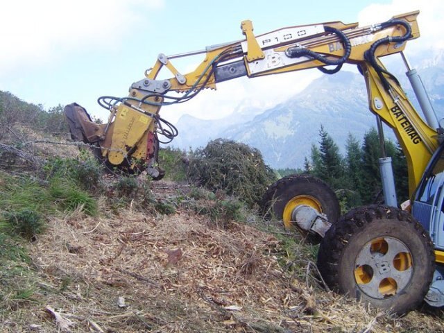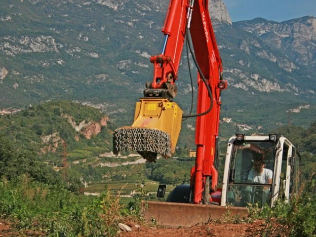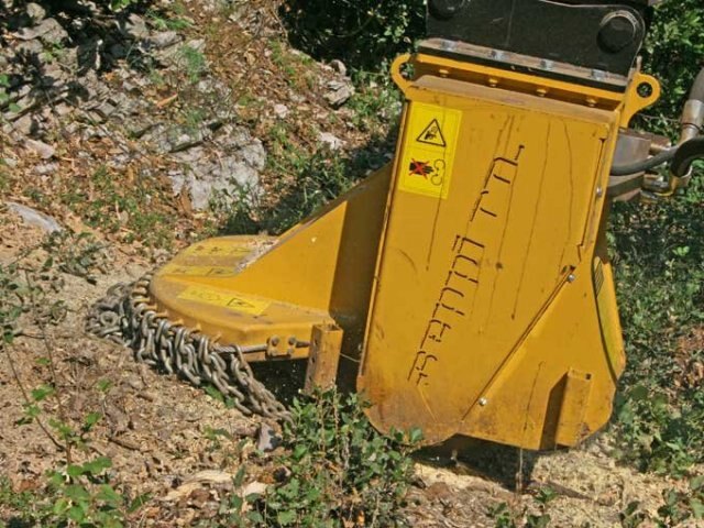 Get rid of the stump completely, in a short time! KASTOR hyd grinds the stumps as deep as 50 cm [20”] below the surface and any diameter . Any stump diameter can be eradicated, by swinging the excavator arm from one to the other side. The result is a fine mulch that may be easily incorporated into the soil and mixed with the ground, which fosters a quick decomposition. The stump has been removed completey, the soil is ready for new planting. The Rotor disk is equipped with very aggressive HRC-tooths. The specially developed angle of cut allows an ideal use of power. The Interface for spider excavators, available as an option, also works as a shovel. It helps mixing the ground stump chips into the soil, so to completely cover the whole left by the removed stump. Working width: 11 cm [ 4,3" ] |