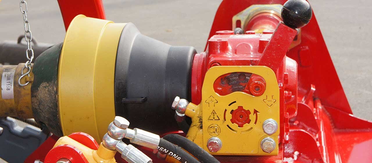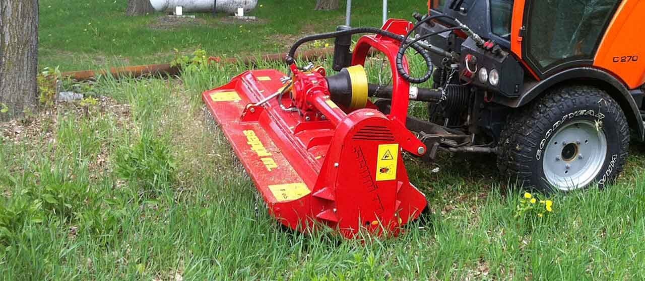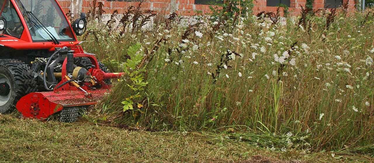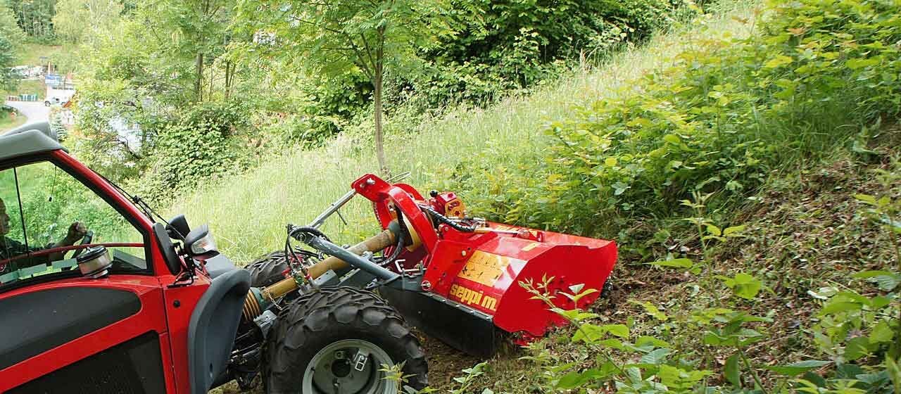 The lightweight construction of the flail mulcher S5 cabrio k allows work on sloping ground. With a manual inverter the rotor can be operated in both directions and the mulching result will be optimized. Depending on the direction of the rotor shaft it mulches low or high grass and brush. Wide-open hydraulic front hood is appropriate to mulch high grass.