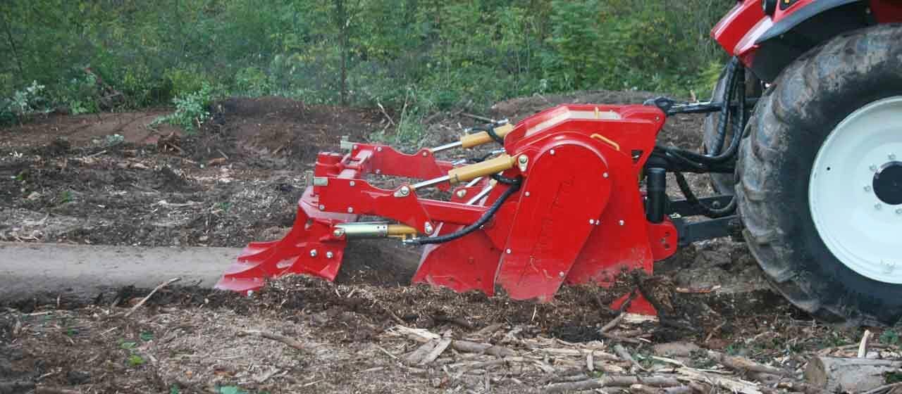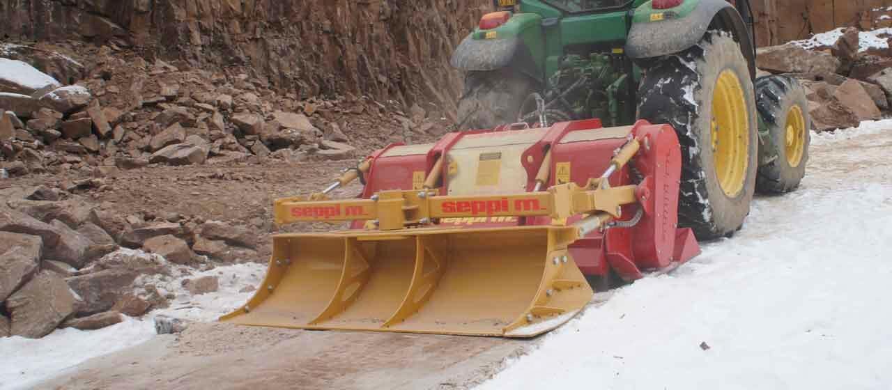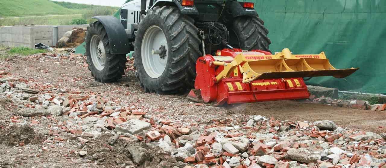 Technical requirements for operating a SEPPI stone crusher on a tractor are creep speeds (max. 0,5 km/h) and a hydraulic three-point tractor linkage.
