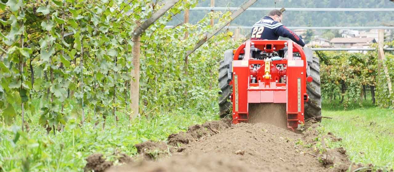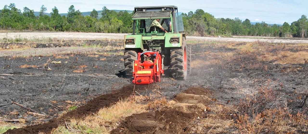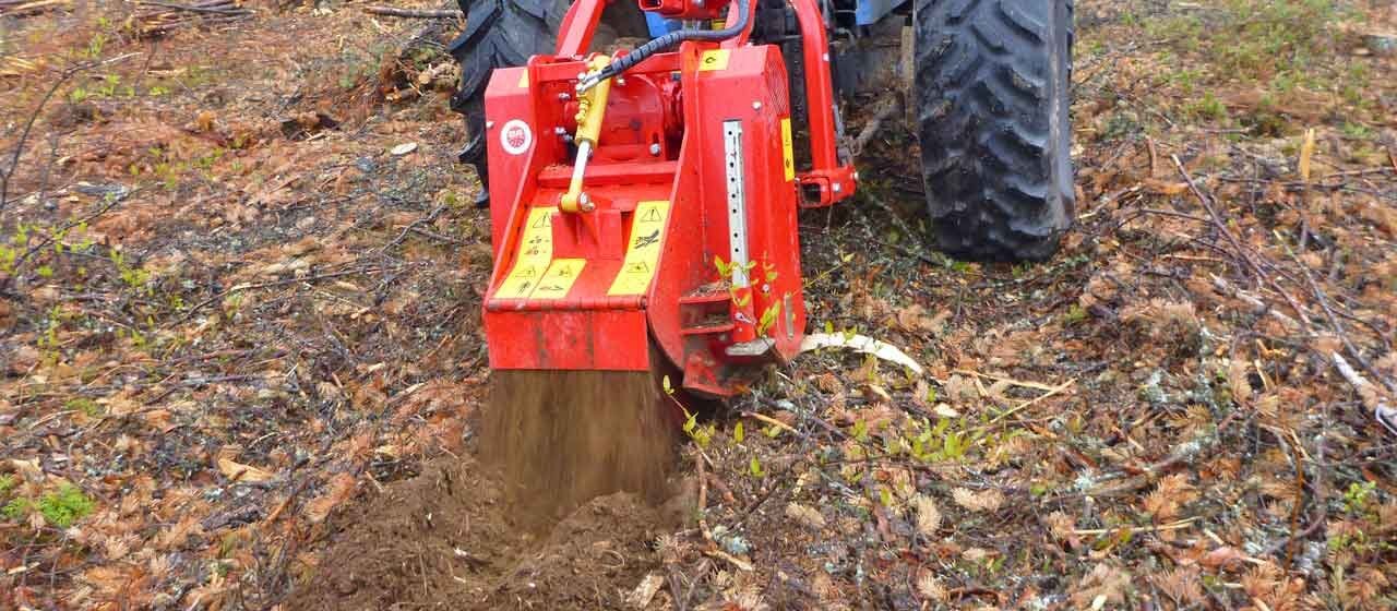 The FC grinds stumps of trees, especially in plantations to be renewed, where stumps are all in a raw. It then prepares the soil for the plantation of new trees. It eliminates tree stumps up to a depth of 27 cm [11"] by grinding them into small pieces and mixing them with the soil.