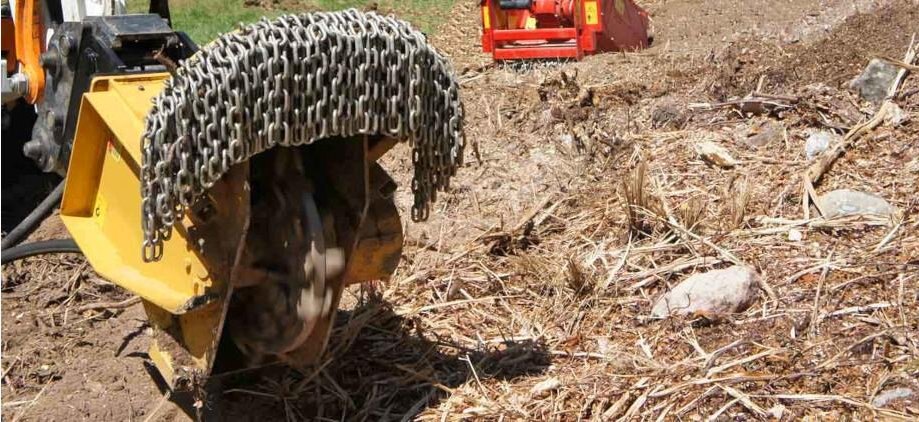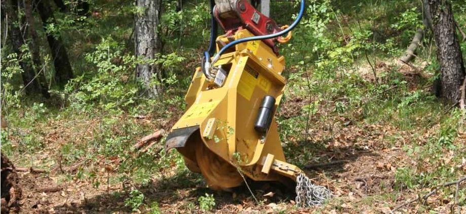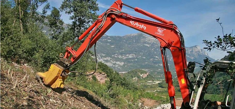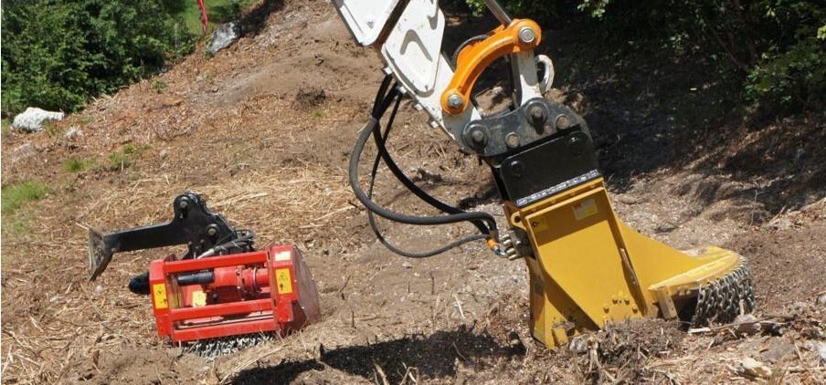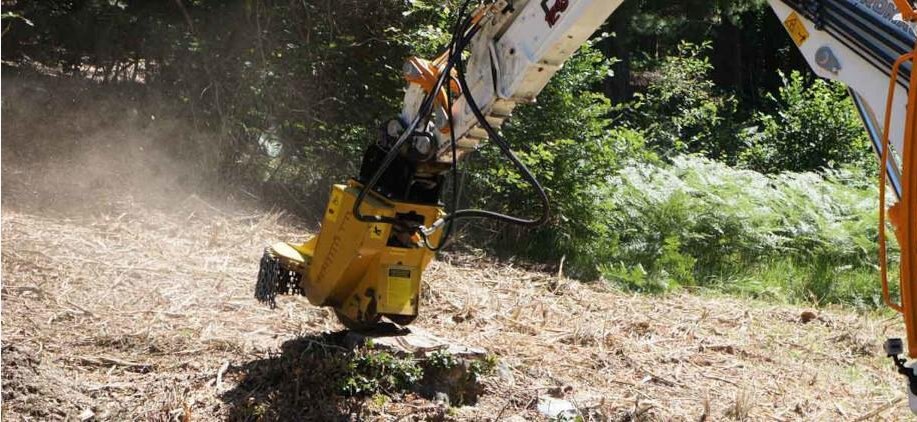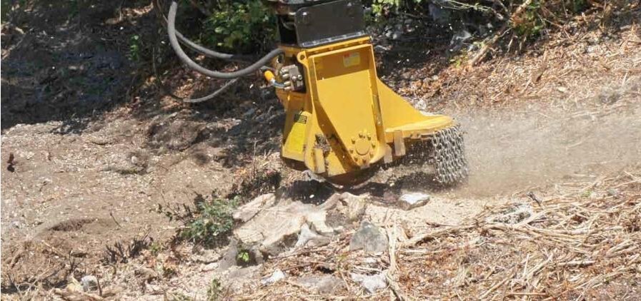 MIDI-KASTOR hyd grinds the stumps as deep as 30 cm [12 inch] below the ground. Any stump diameter can be eradicated, by swinging the excavator arm from one to the other side. The result is a fine mulch that may be easily incorporated into the soil and mixed with the ground, which fosters a fast decomposition. The stump has been removed completey, the soil is ready for new planting. The Rotor disc is equipped with very aggressive HRC-tooths. The specially developed angle of cut allows an ideal use of power.