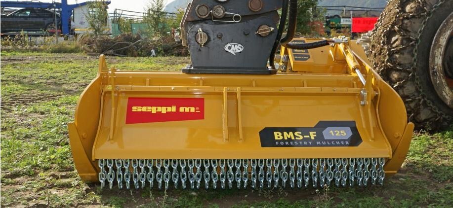 The SEPPI mulching head BMS-F is a special attachment to be applied on different types of excavators, railroad or special vehicles or forwarders, working to maintain railways and other areas difficult of access. This SEPPI excavator mulcher BMS-F has a very strong casing and strong bearings that make it very resistant, no matter in what position it works. Chassis is made of wear-resistant steel AR400 and has a low profile for more flexibility. The SEPPI patented fixed hammer rotor with strong bearings for high performance even in vertical positions is powerful and exposed and particularly strong to bear frequent vertical mulching. An exposed, aggressive rotor is very effective against thick vegetation of up to 20 cm [8"] in diameter. This rotor has been specially designed to withstand strong lateral loads and also works reliably even in vertical positions. Transmission with automatic variable displacement motor M-BOOST (60-80 cm3) with relief valve. The motor is well protected.