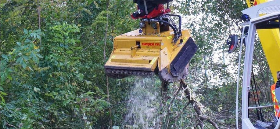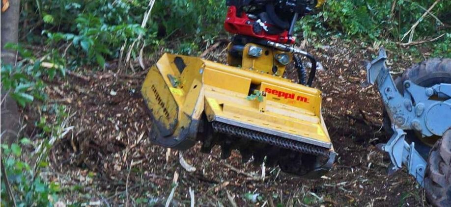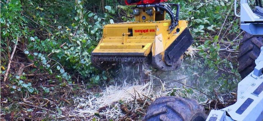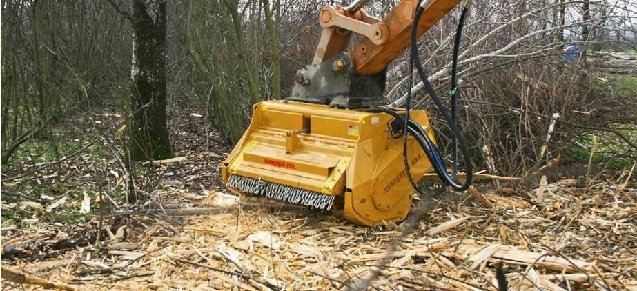 Newly updated, the SEPPI excavator mounted forestry mulcher BMS is more efficient, more productive, and has an attractive new design. Designed for excavators in the 15 - 30 ton class (30,000 - 66,000 lb), grass, brush and wood are easy to mulch. Attached to the arm of an excavator, all these areas can easily be reached. The SEPPI mulching head BMS comes with a forestry rotor able to mulch vegetation up to 30 cm [12"] in diameter. Covered chassis protects the drive. Forestry rotor with tempered counter knives inside the casing standard for very fine mulching result.