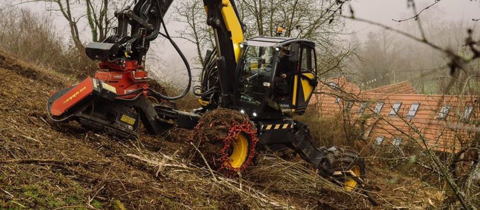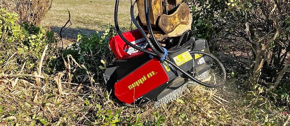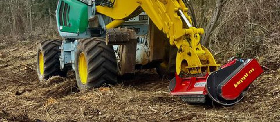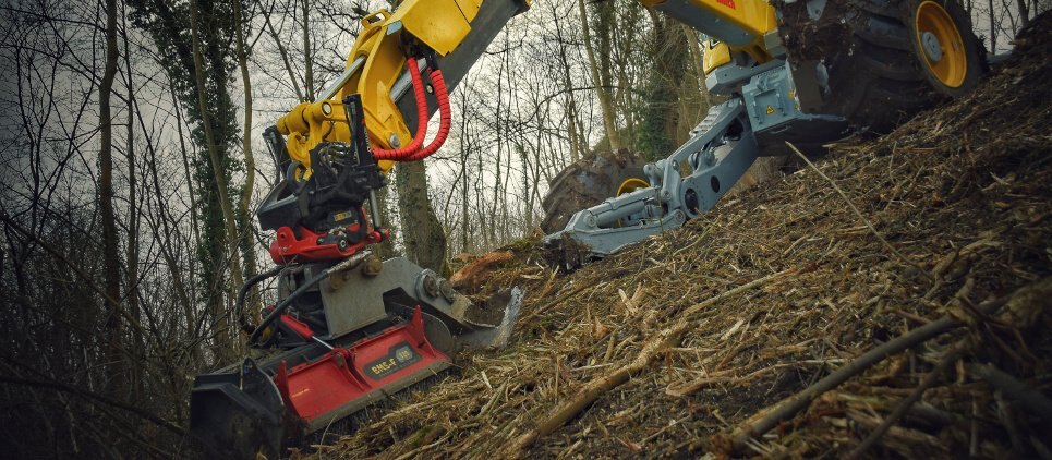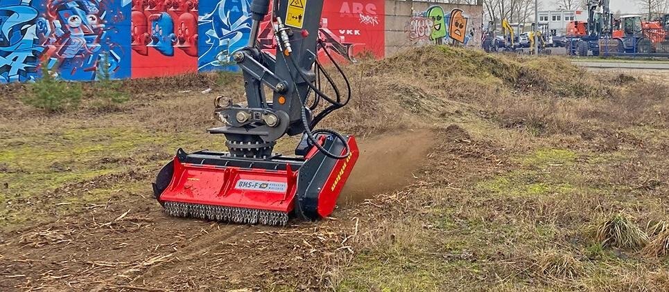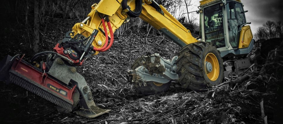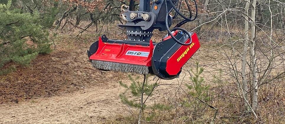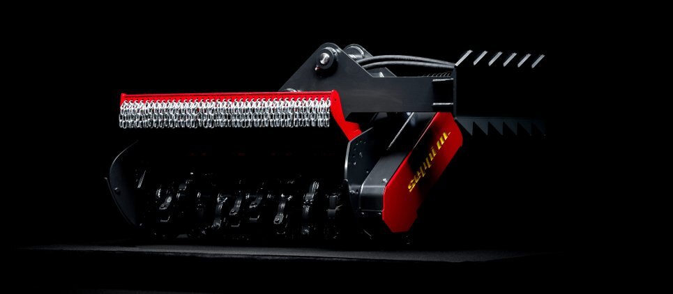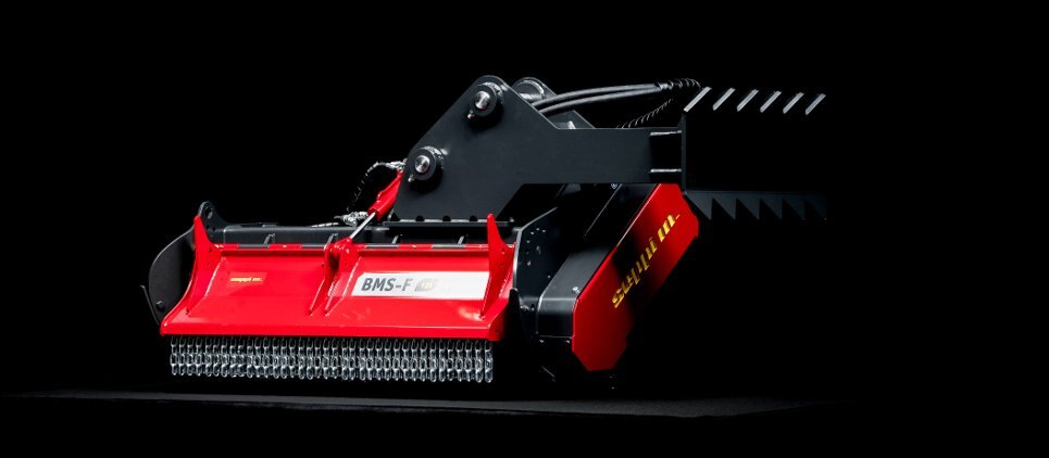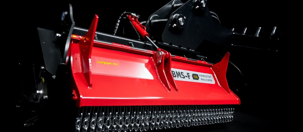 The SEPPI mulching head BMS-F is a special attachment to be applied on different types of excavators, railroad or special vehicles or forwarders, working to maintain railways and other areas difficult of access. This SEPPI excavator mulcher BMS-F has a very strong casing and strong bearings that make it very resistant, no matter in what position it works. Chassis is made of wear-resistant steel AR400 and has a low profile for more flexibility. The SEPPI patented fixed hammer rotor with strong bearings for high performance even in vertical positions is powerful and exposed and particularly strong to bear frequent vertical mulching. An exposed, aggressive rotor is very effective against thick vegetation of up to 20 cm [8"] in diameter. This rotor has been specially designed to withstand strong lateral loads and also works reliably even in vertical positions. Transmission with automatic variable displacement motor M-BOOST (60-80 cm³). The motor is well protected. Rotor (opt) with CUT CONTROL system: MINI BLADE tools with sharpenable blade, in combination with a specially developed gauge, to reduce the depth of cut. Ideal for maintaining vegetation alongside railways, clearing forests after harvesting wood and much more. Available working width: 100, 125, 150 [39", 49", 59"]. |