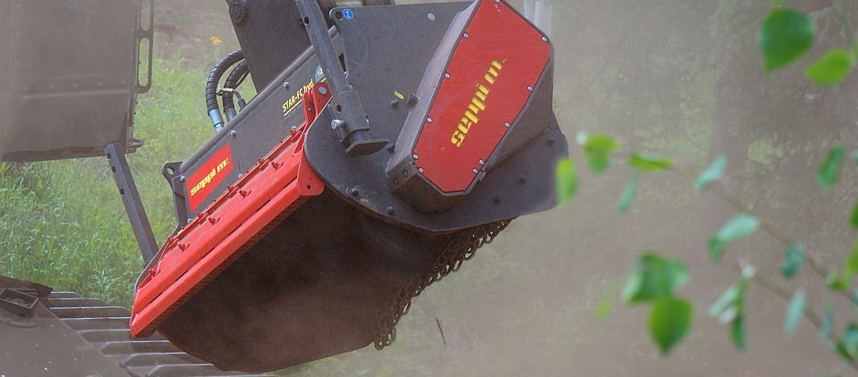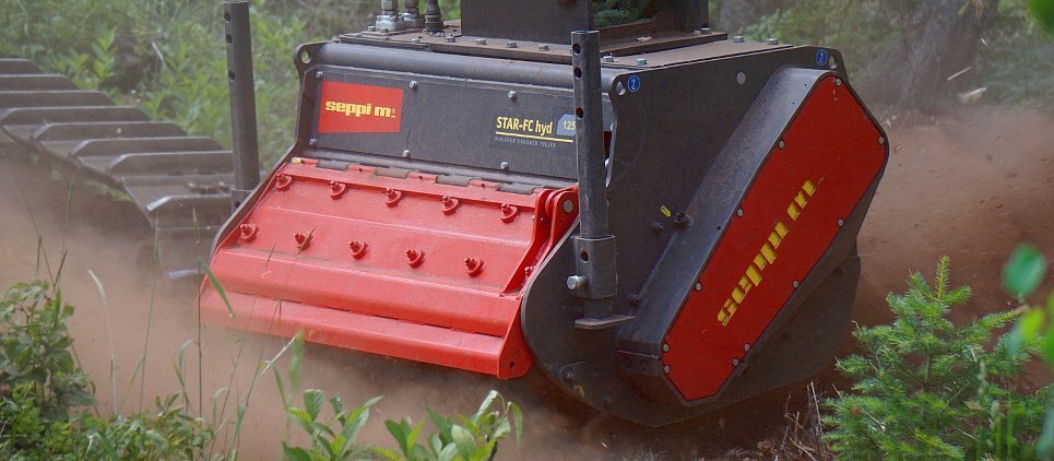 The stump grinders made by SEPPI M. are strong and efficient machines. Wood and other vegetation will be tilled, ground finely and incorporated into the soil, where it will quickly decompose. The soil will be ready to plant or for other uses. Typical use of SEPPI stump grinders: · in agriculture and forestry they will grind and mulch stumps and roots of felled material and till the soil The SEPPI STAR-FC hyd is a multi-purpose stump grinder and soil tiller for excavators from 15-35 tons [30,000-70,000 lb]. With the aggressive patented rotor of new generation V-LOCK with efficient hammer combination of the new type, ULTRA MONO PROTECT + MONO & ULTRA MONO EXTREME with additional tungsten carbide tips STAR-FC hyd mulches wood up to 40 cm in diameter and crushes stones up to 15 cm, and tills as deep as 30 cm below the surface. Very strong frame, for a very long life made of wearresistant steel with tempered counter knives for a perfect mulching result. CARBONCHAIN gear belts provide high strength and length stability with high flexibility. STAR-FC hyd has a very strong chassis S420 with replacable plates AR400 for a very long life. ISOBUS system (temperature, cooling, hour counter) - with ISOBUS terminal The multi-functionality is one of most important features of SEPPI M. machines. Available working width: 75, 100, 125 [30", 39", 49"]. |