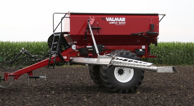VALMAR AirFlo 8600 Pull-Type Fertilizer Spreader Delivering Greater Capacity and Flexibility in a Commercial Pull-Type Spreader Cover More Acres in Less Time Designed to meet the needs of large-scale farm businesses, the Salford Valmar Airflo 8600 is a high-capacity, pull-type spreader that delivers the highest rates of application currently available in a commercial spreader. Thanks to its advanced design, the Airflo 8600 delivers rates as high as 1,000 pounds per acre at 8 miles per hour, allowing you to finish large jobs faster than ever. Accurate Metering System The Airflo 8600 precise rate is a result of the ground-driven metering system that automatically adjusts on the go to ensure a uniform application rate regardless of ground speed. The hydraulically engaged metering system is based on a 30-setting, oil bath gearbox combined with a two-speed gear ratio to allow 60 settings that can be adjusted in increments of seven percent. This enables operators to select from more settings at closer increments, a feature that translates into more control over application rate for substantial savings in fertilizer costs. The 8600 can also be equipped with a hydraulic drive metering system for those using variable rate technology. Spread More Product between Fills The 8600’s extra-large, 230-cubic-foot hopper can carry up to seven tons of product. With a capacity like that, you’ll be able to cover more acres between fills. The hopper itself is constructed of corrosion-resistant, painted 409 stainless steel and comes with a roll tarp installed. Ideal for Row Crop Farming Originally designed to meet the needs of row crop farmers, the 8600 features axles which can be adjusted from 72 inches to 120 inches to accommodate most row spacings. In addition, the 8600 can be equipped with optional tire sizes to achieve greater flotation or narrower tracking, depending on the operation. High Capacity PTO or Hydraulic Driven Fan This fan has field-proven history on the Air Max. With an operating speed of 4,700 RPM, the fan’s air flow feeds through a nine-inch outlet directly to a two-piece manifold. Important features include a 17-inch fan impeller with plastic impeller blades and a four-band fan belt with tightener. The standard fan drive is a 1,000 RPM, 1 3/8-inch, 21T spline drive shaft. An optional 20T, 1 3/4-inch yoke with bridge is available for those requiring a larger driveline. Valmar also offers an optional hydraulic driven fan drive. This option requires 35 gallons per minute hydraulic flow operating at 2225 PSI – well within the capability of some of today’s higher capacity tractors. Durable and Easy to Maintain The 8600 includes a number of important features that provide for increased durability and easier maintenance. For long life, the hopper and booms are manufactured from stainless steel. There is easy access to all mechanical parts including the manifold. Finally, calibration and emptying of the unit is easier, thanks to funnel trays that are inserted under the metering system for easy collection of material. Choose Boom Width to Match Your Needs The Valmar 8600 comes with a standard 66-foot boom but can also be equipped with optional boom widths of 60 feet, 54 feet or 57 feet, allowing you to match boom width to your crop requirements. Booms are hydraulically folded and feature a hydraulic shut-off on the right boom to allow application on the left side only. All booms are equipped with rubber torsion boom suspension (which do not require any service and reduce friction, bouncing, and wear) and manual folding, break-away tips to minimize damage that may occur from striking obstacles in the field. Easy to Operate Designed for easy use, all important field operations on the Valmar 8600 are hydraulically controlled from the cab through the use of three separate hydraulic lines (four lines with optional hydraulic fan drive). For example, the booms are folded, unfolded and locked hydraulically (through the use of a sequencer valve), allowing quick and easy transition to and from transport position. Also, the metering drive wheel is engaged or disengaged hydraulically and comes equipped with a lockout valve to ensure ongoing positive engagement. Finally, half width application is possible thanks to a hydraulically operated half shut-off clutch system that comes equipped with a pressure relief valve for trouble free operation. |