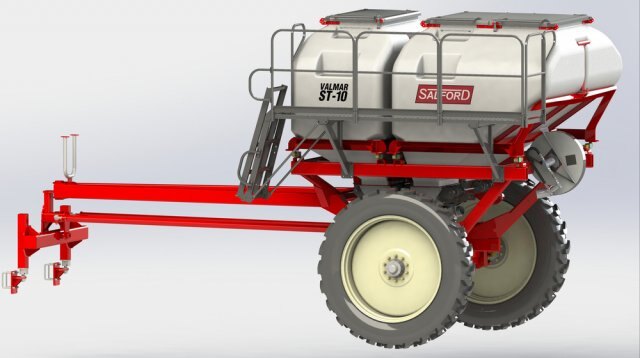 | The number of air outlets is determined by the funnel/air manifold assembly, which can be easily changed by simply unbolting it from the metering system. Updating from a 12-outlet to 16-outlet system can be achieved in a matter of minutes. A 20” fan driven by a 12cc hydraulic motor spins at up to 5900 rpm to provide plenty of air at high rates. By maintaining a set pressure in the air plenum behind the venturi manifold, a constant, reliable airflow can be achieved regardless of the number of outlets. Available in a Skid Mount Package The ST-10 is available independently as a skid-mounted system for use on 3rd party implements such as strip-till and applicator toolbars. The polymer tanks are designed to be configured for multiple applications. They will soon be available with liquid fertilizer or pressurized air system upgrade kits. In the case of the liquid upgrade, the ST-10 will have the unique capability to deliver liquid and dry product on the same steerable frame. The pressurized upgrade brings the highly accurate Salford air seeding metering system to the ST-10 and allow product to be delivered reliably to wider implements. Heavy Duty Cart The 5-link mechanical steering uses the Ackerman steering principal by which the inner wheel turns more sharply than the outer wheel. This combined with a long hitch allows the cart to mimic the travel of the leading implement with a higher degree of precision. The high clearance axle allows the cart to follow application toolbars in standing crop without causing damage to the rows. Large diameter tires allow for row-crop tracking while minimizing compaction. A tow hitch can be added for towing anhydrous ammonia tanks as well. |