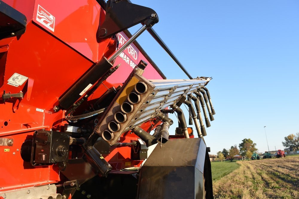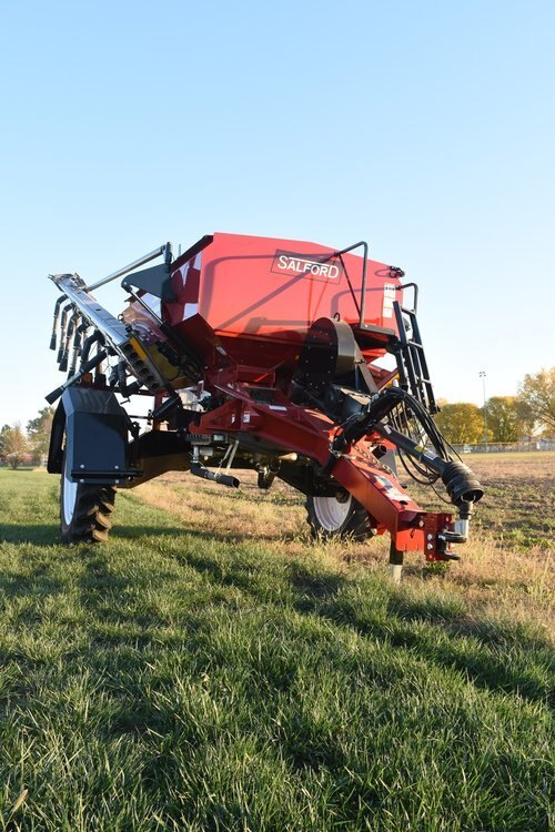 ACCURATE METERING SYSTEMThe 8700 precise rate is a result of the conveyor chain delivery system that either hydraulically or mechanically adjusts the application rate based on travel speed. The mechanical drive (available on 8708 only), hydraulically engaged, metering system is based on a 30-setting, oil bath gearbox combined with a two-speed gear ratio to allow 60 settings that can be adjusted in increments of seven percent. This enables operators to select from more settings at closer increments, a feature that translates into more control over application rate for substantial savings in fertilizer costs. The 8708 can also be configured with a hydraulic drive metering system for those using variable rate technology. The 8711 is available as a hydraulically driven metering unit only. SPREAD MORE PRODUCT BETWEEN FILLSThe 8700’s extra-large, 260-cubic-foot hopper can carry up to eight tons of product (8708) or 357-cubic foot hopper carrying 11 tons of product (8711). The hopper itself is constructed of corrosion-resistant, painted 409 stainless steel and comes with a roll tarp installed. IDEAL FOR ROW CROP FARMINGOriginally designed to meet the needs of row crop farmers, the 8700 features axles which can be adjusted from 72 inches to 120 inches to accommodate most row spacings. In addition, the 8700 can be equipped with optional tire sizes to achieve greater flotation or narrower tracking, depending on the operation. HIGH CAPACITY PTO OR HYDRAULIC DRIVEN FANThis fan has field-proven history on the Air Max. With an operating speed of 4,700 RPM, the fan’s air flow feeds through a nine-inch outlet directly to a two-piece manifold. Important features include a 17-inch fan impeller with plastic impeller blades and a four-band fan belt with tightener. The standard fan drive is a 1,000 RPM, 1 3/8-inch, 21T spline drive shaft. An optional 20T, 1 3/4-inch yoke with bridge is available for those requiring a larger driveline. Valmar also offers an optional hydraulic driven fan drive. This option requires 35 gallons per minute hydraulic flow operating at 2225 PSI – well within the capability of some of today’s higher capacity tractors. DURABLE AND EASY TO MAINTAINThe 8700 includes a number of important features that provide for increased durability and easier maintenance. For long life, the hopper and booms are manufactured from 304 stainless steel. There is easy access to all mechanical parts including the manifold. Finally, calibration and emptying of the unit is easier, thanks to funnel trays that are inserted under the metering system for easy collection of material. CHOOSE BOOM WIDTH TO MATCH YOUR NEEDSThe Valmar 8700 comes with a standard 60 foot row crop boom or 72 foot broadcast spread, allowing you to match boom width to your crop requirements. Booms are hydraulically folded and feature a sectional shut-off to allow application on the left or right side only. All booms are equipped with hydraulic boom suspension to allow the operator to adjust tip height and match field contours. Automatic folding, break-away tips are integrated within the fold and locking sequence and minimize damage that may occur from striking obstacles in the field. EASY TO OPERATEDesigned for easy use, all important field operations on the Valmar 8700 are hydraulically controlled from the cab hydraulic remotes. For example, the booms are folded, unfolded and locked hydraulically (through the use of a sequencer valve), allowing quick and easy transition to and from transport position. The metering system relies on a hydraulic remote to either engage and disengage the mechanical metering or provide constant flow for the hydraulically controlled metering system. Boom tip height can the adjusted on the go up to 8 feet, to follow uneven terrain. COVER CROPSSalford's Valmar air boom applicators gently and accurately handle seed, fertilizer and other granular like herbicides. Equipped with 60 ft booms and drop tube kit, the 8700 delivers granular product on 30 inch centers. Combined with row crop tire options the 8700 has the clearance to direct cover crops between rows of established corn crops. OPTIONS: