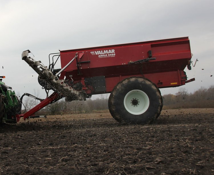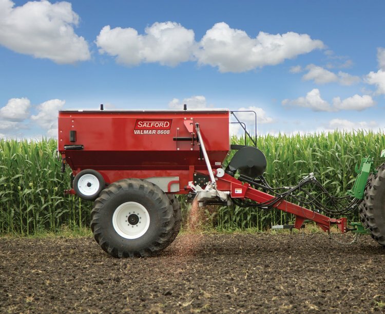 Salford's Valmar air boom applicators gently and accurately handle seed, fertilizer and other granular like herbicides. Equipped with 60 ft booms and drop tube kit, the 8600 delivers granular product on 30 inch centers. Combined with row crop tire options the 8600 has the clearance to direct cover crops between rows of established corn crops.