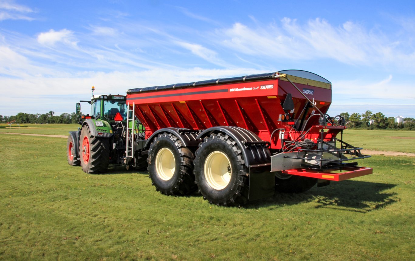 | Build for efficiency and performance, Salford’s BBI MagnaSpread Plus+ combines the use of one spreader to maximize both fertilizer and lime application widths, saving you time and money. This machine has the capacity to spread dry fertilizer up to 120’ and lime up to 60’ – all with one machine. The new MagnaSpread Plus+ builds on the industry leading performance of Salford’s BBI MagnaSpread by adding new technology to maximize your investment. |