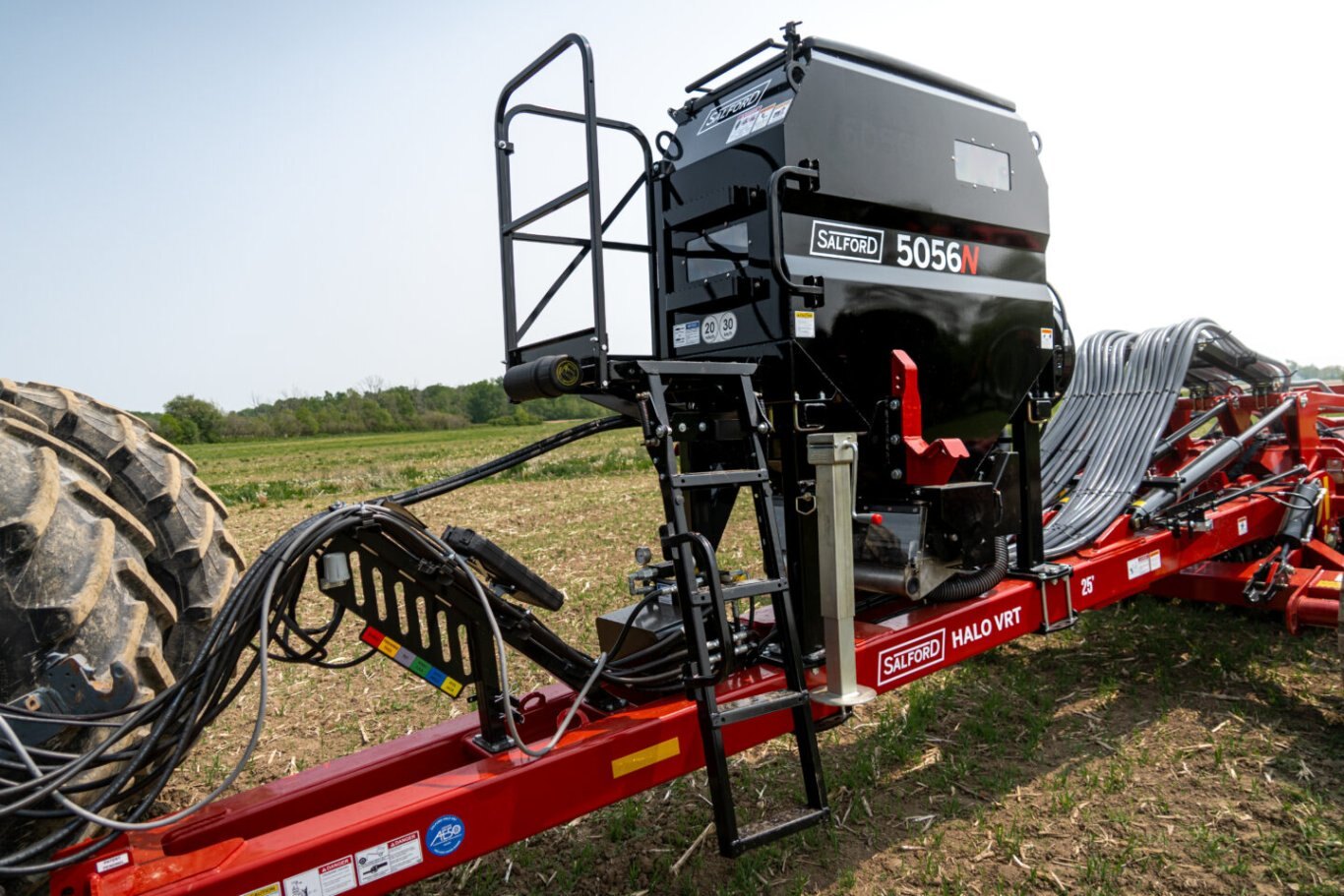 56N models have been designed to fit onto the frame of Salford’s HALO narrow folding tillage implements. Along with being narrow enough to fit onto the HALO frame, the 5056N has a 50 cubic foot capacity, and the 7056N has a 70 cubic foot capacity. The hopper sizes are designed to pair with HALO models to minimize the time between fills. The 56N models have large hopper openings for faster filling. The large opening also provides easy access, should maintenance be required inside the hopper. The steel bin screens are designed for fast filling, while prevent large clumps of fertilizer and foreign material from being fed into the system. Sight windows near the top and bottom on each side of the hopper allow the operator to see when the bin is full and when it is nearly empty. An operator platform with a folding and locking ladder gives the operator safe and easy access to the hopper.