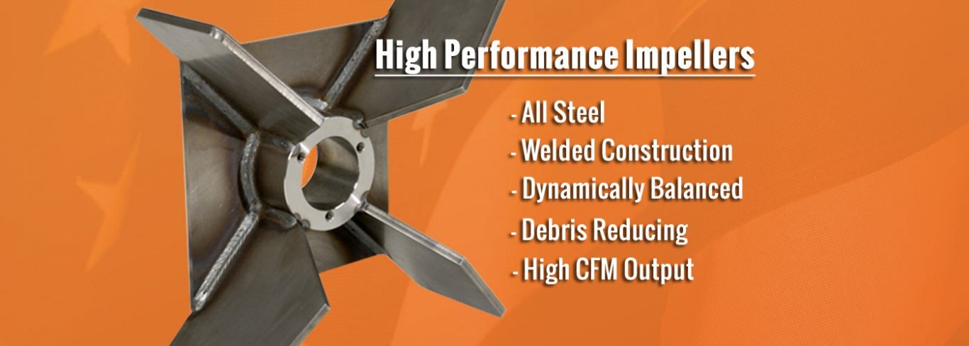 Welded steel impeller with thick steel blades is dynamically balanced. Reduced vibration, longer life and less stress on the engine. |