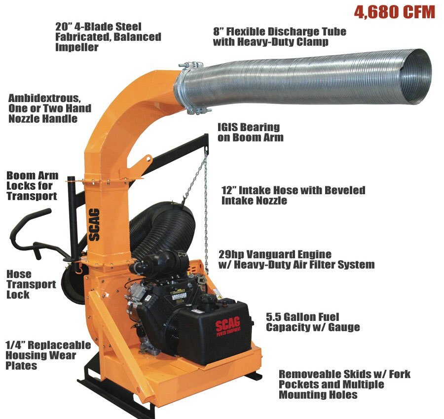 // Powerful 29 hp Vanguard commercial-grade engine with heavy-duty air filtration system for extended engine life // Heavy-duty welded steel engine platform / skid mount for long, reliable unit life // 3/8" thick , 4-blade, welded steel impeller, dynamically balanced, high-CFM, debris reducing design // Tapered impeller hub standard // 10 gauge welded steel blower housing // 1/4", serviceable, steel blower housing wear plates are standard equipment // 12" diameter intake hose, .045 black thermoplastic rubber, wire helix with wearstrip. Length 120". // Quick-detach feature allows the intake hose to be removed from the blower housing for storage, transport or cleaning. No tools required. // 16 gauge, angle-cut intake nozzle with 7-gauge reinforcement plate at handle mount // Ergonomic, ambidextrous, one or two-handed intake handle with thick, comfort foam grip // Easy rear access to the impeller and the wear plates for cleaning and servicing // All steel, welded boom arm features Igis bearing for smooth movement // Boom features a transport position with spring-loaded locking pin that keeps the boom secure during transport // Hose support chain is easily height adjustable, without tools, for quick hose height changes // Intake nozzle can easily be secured to the trailer for transport with an innovative transport pin system // 5.5 gallon fuel tank with built-in fuel gauge