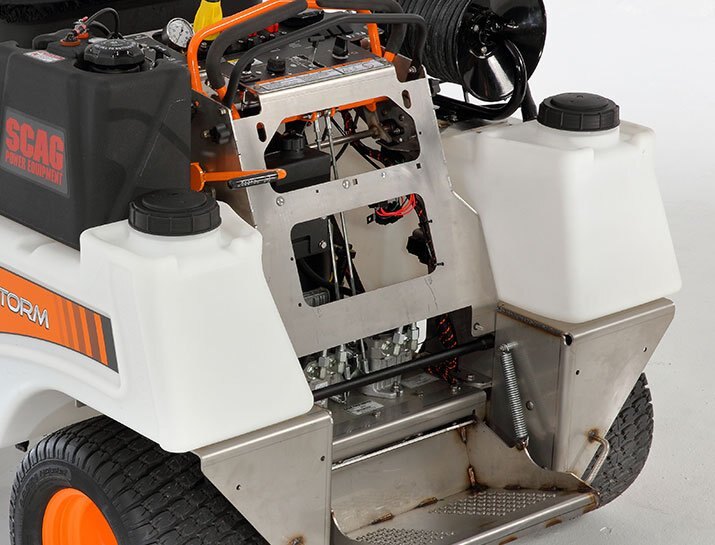 Removable cushion and open lower area allow quick and easy service access to the hydro drive pumps, hydro reservoir and other mechanicals.