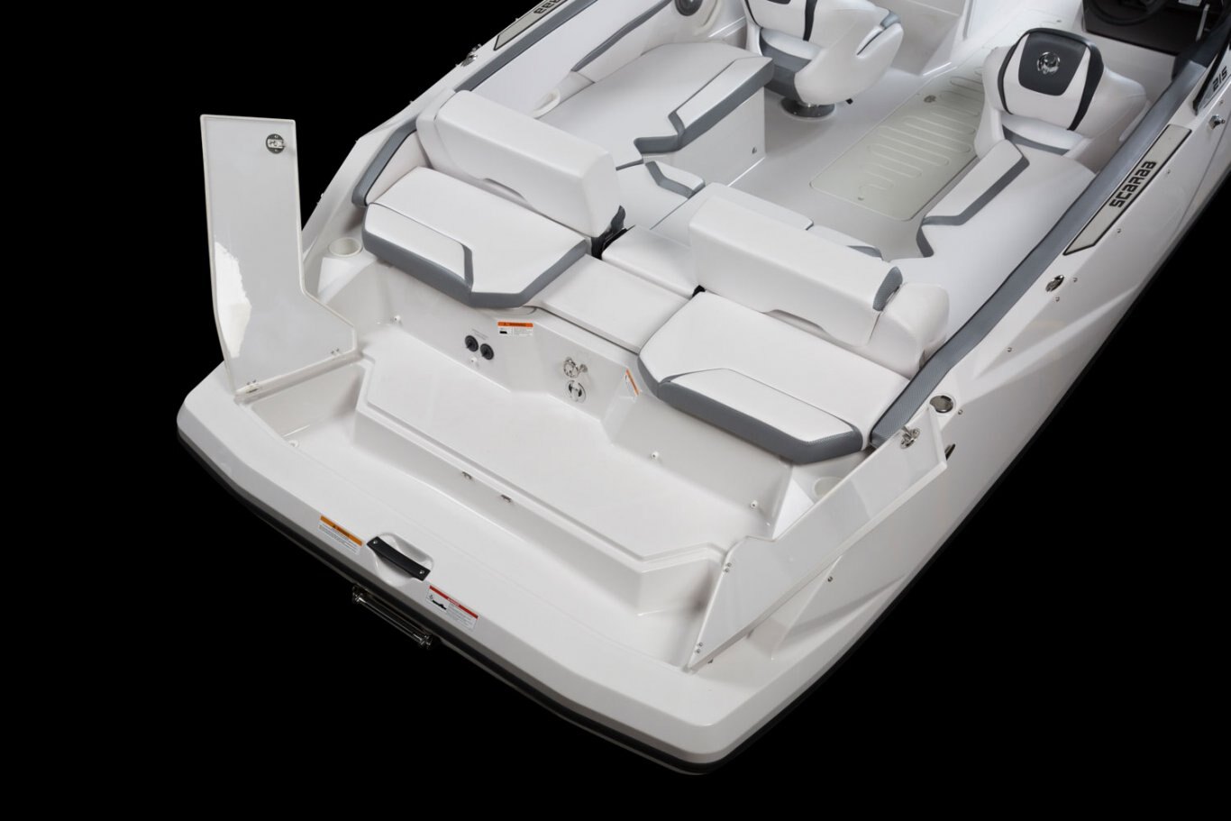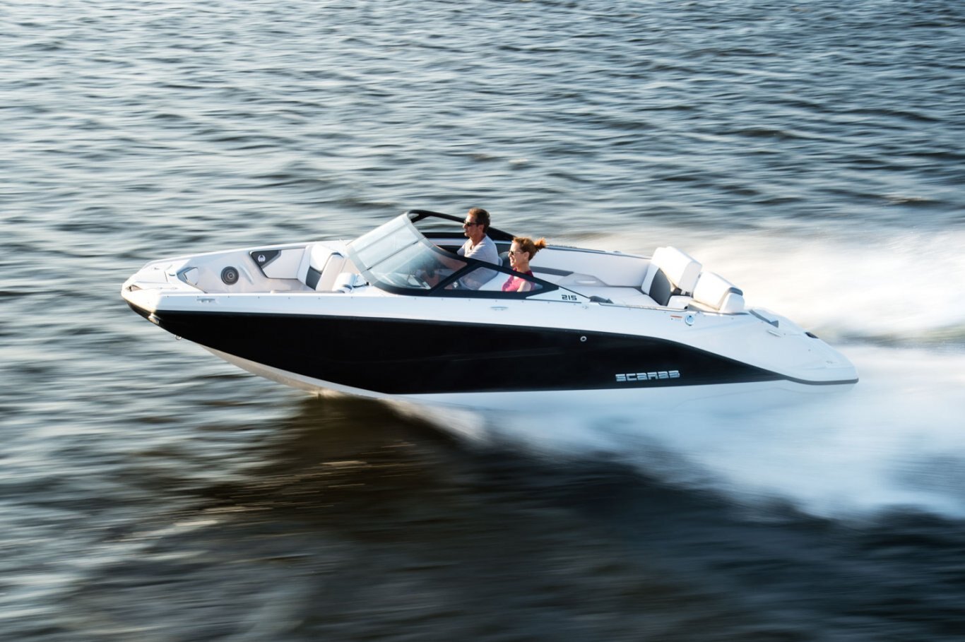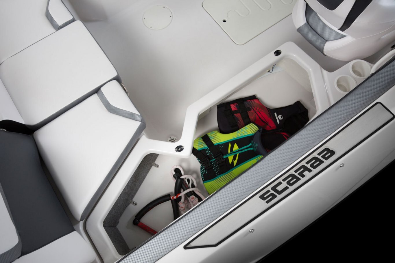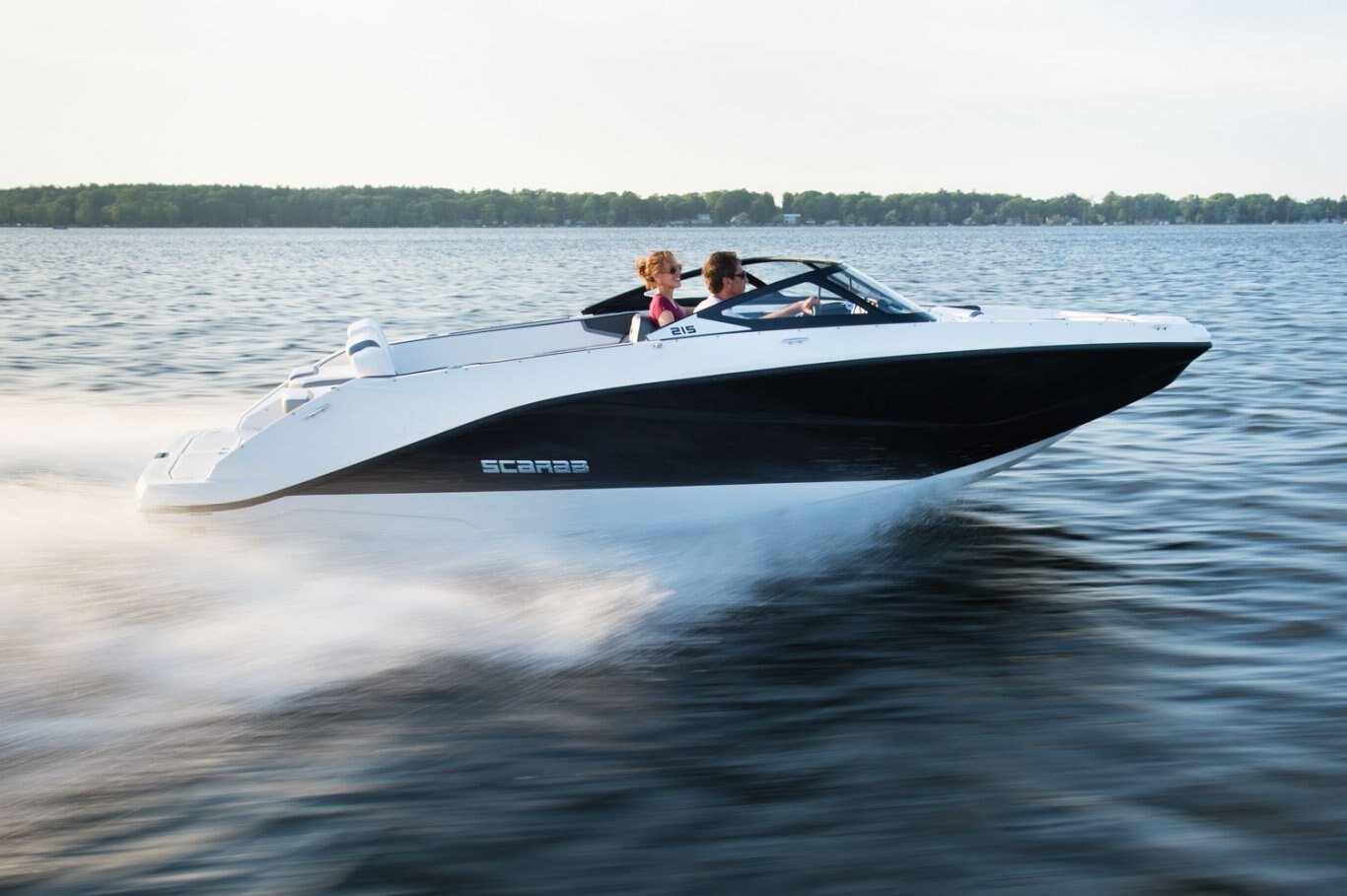 With Twin Rotax® jet engines at your disposal and a standard Bimini top, the 215 G is ready for the party. Deep storage compartments and plush notched seating will keep the interior clear and your crew in high spirits for day after day of Scarab fun. LOA / 21' Persons Capacity / 10 people Fuel Capacity / 41 gal |