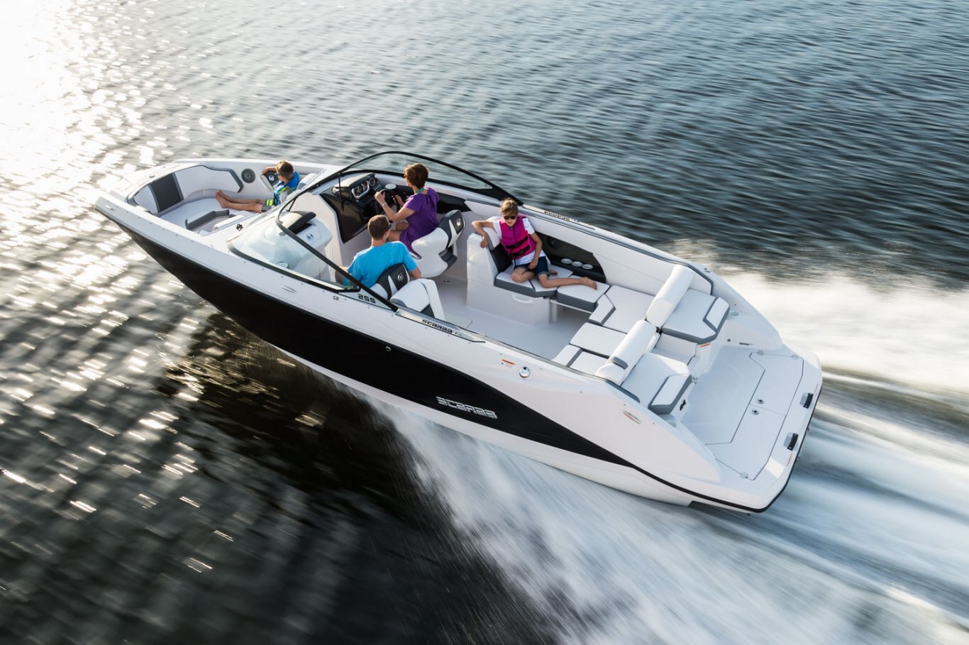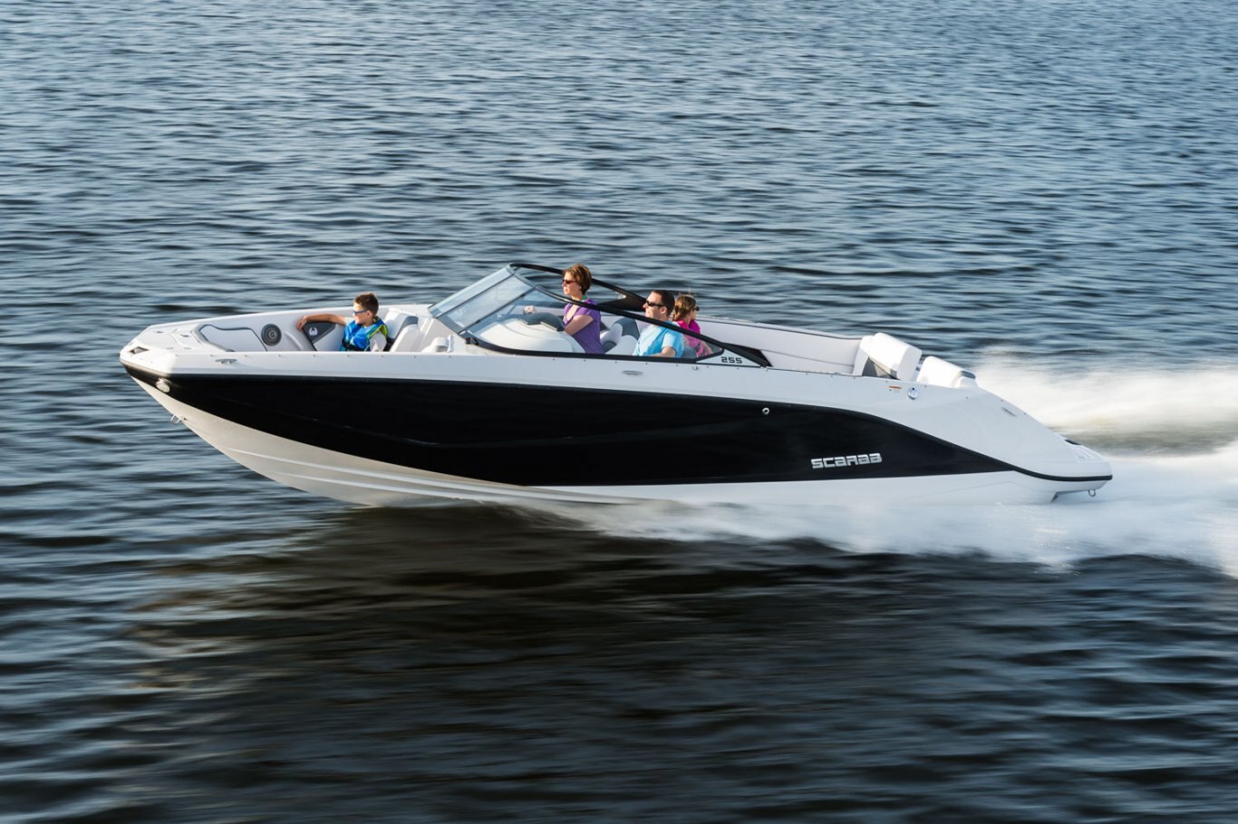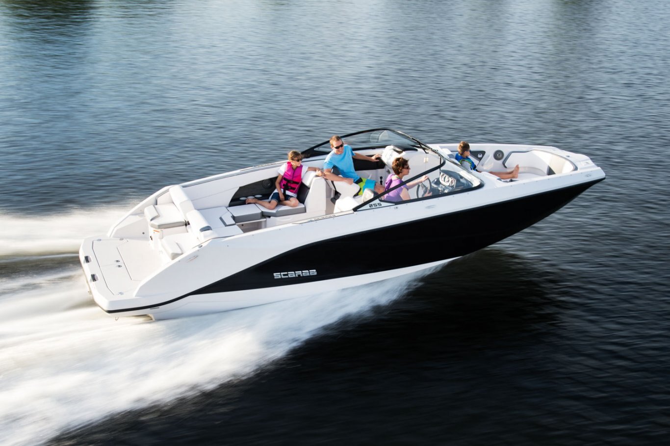 When you desire more than above and beyond, the Scarab 255 G is the next step in luxurious, sporty jet boats. The astute black exterior combined with a standard trailer, cavernous storage, a Bimini top, and notched seating puts this jet boat in a sector of its own. With capacity for 13 and all their gear, you will never want to return to the dock. LOA / 25' Persons Capacity / 13 people Fuel Capacity / 56 gal |