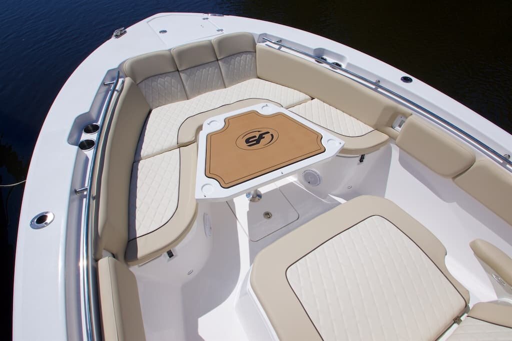 - Curved bow backrest cushions (aft-facing) with removeable bottom cushions