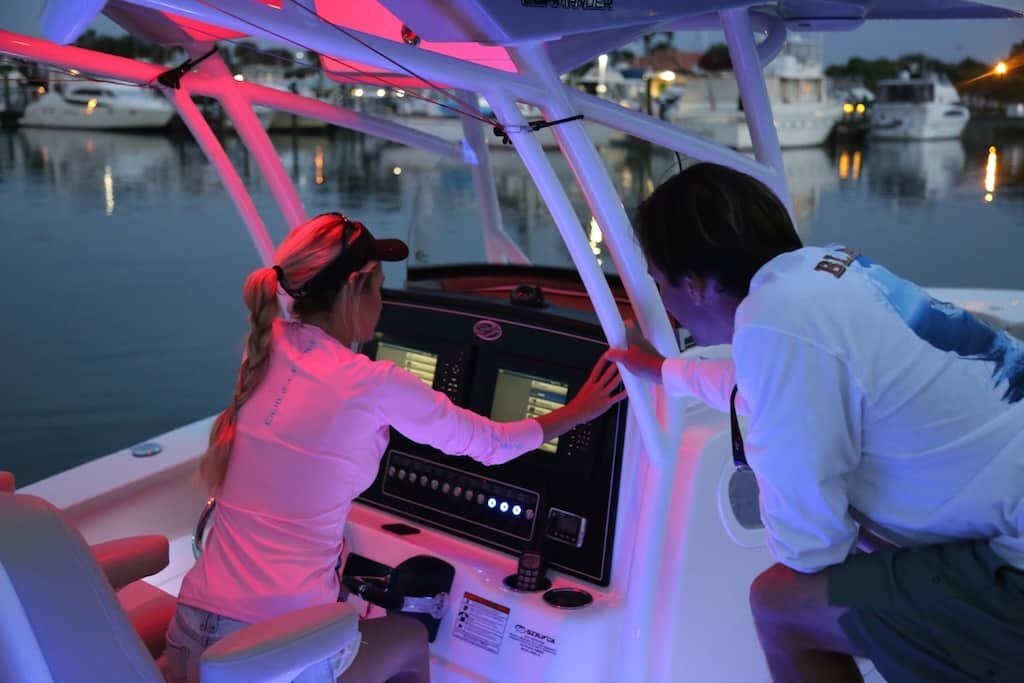 - Insulated in floor fishboxes (40-gallon port, 45-gallon starboard) with overboard discharge pumps