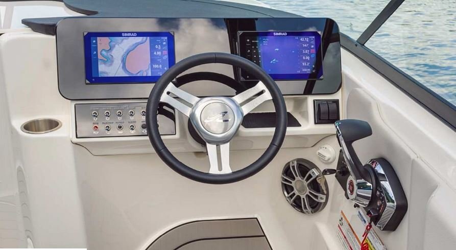 Base technology features include a 9” Simrad display as well as a helm charging station with comfort and convenience features throughout.
