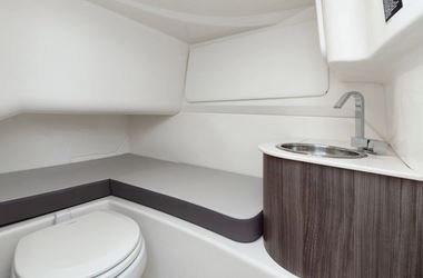 A reclining cockpit backrest expands the aft sunpad and gives room to spread out and soak in the sun. Helm and portside seat backrests convert to give full versatility to the cockpit layout. The ample starboard interior storage space under the helm can be upgraded to add a head, further extending your day on the water.