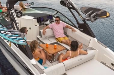 Arrange and re-arrange to your heart’s content. Reversible seat backs can be configured for conversation and watching watersports. To extend your boating season, an optional cockpit heater with Surfinity patented heated blanket can be added.