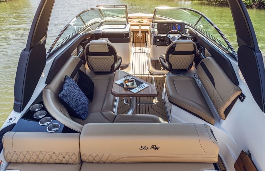 Get out on the water faster with a host of technologies designed for confident captaining and simple monitoring of the boat’s systems. The helm places everything within reach and offers a standard Dual Digital Dash™ featuring 9″ Simrad® touchscreen displays with Mercury Marine® SmartCraft® Connect, Active Trim control & monitoring, and CZone® digital switching.