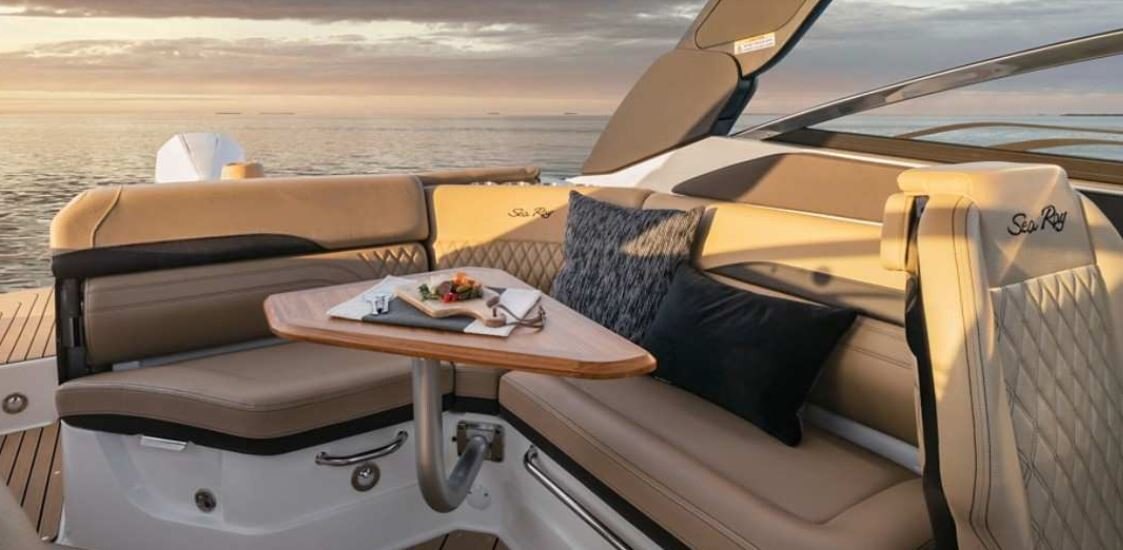At night, captivating features illuminate to set the mood when enjoying a moonlit evening out on the water or returning from a sunset cruise. LED RGB-W color-changing lighting is available with the Lighting bundle to further enhance your nighttime experience. Choose both the Lighting bundle and Power Tower upgrade for a vibrant Sea Ray logo projection light that shines on the cockpit floor.