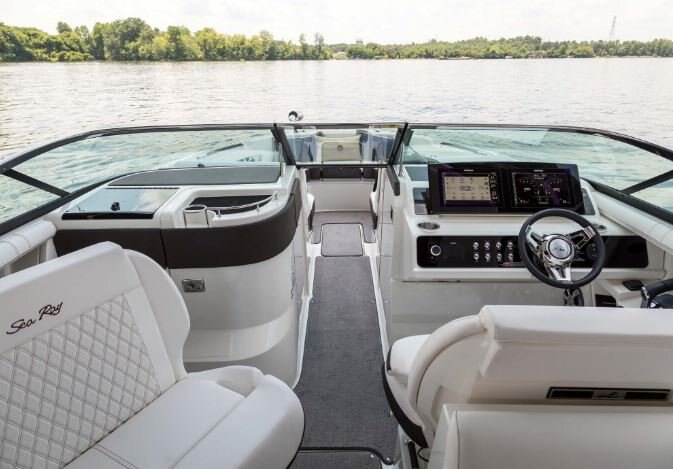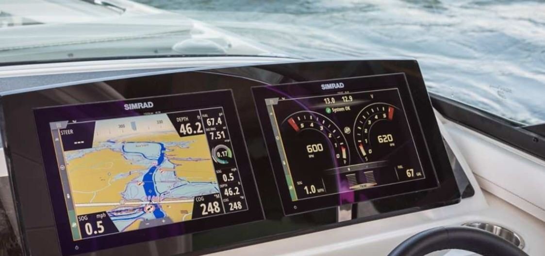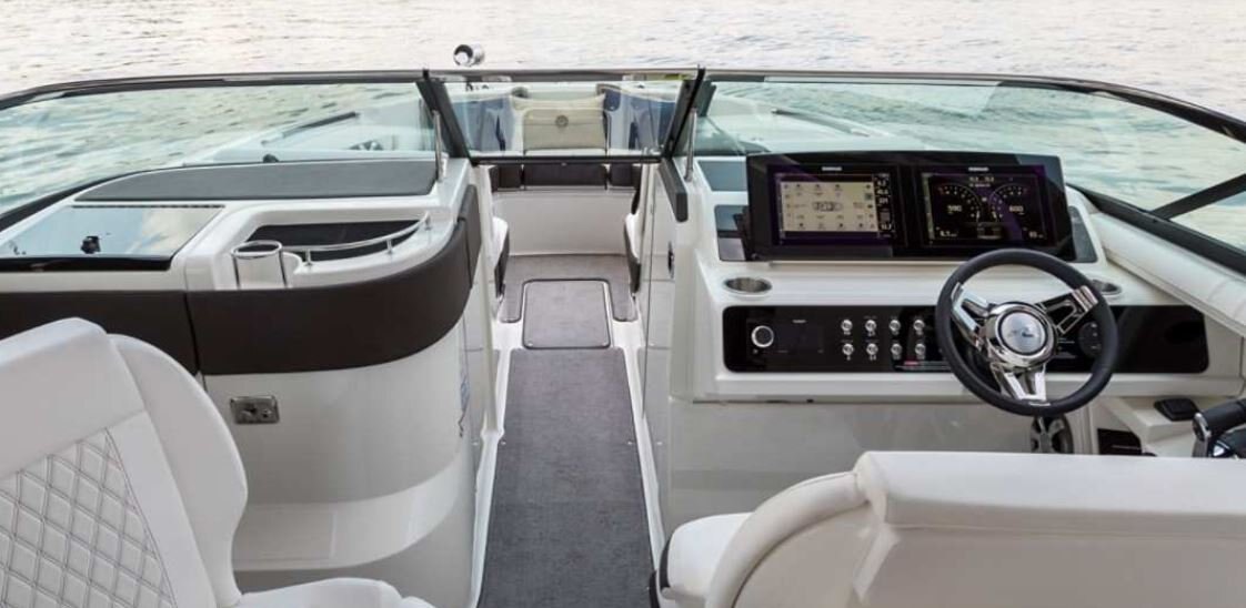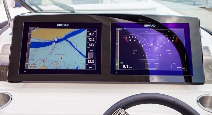 The intuitive helm comes standard with dual 9" (optional 12") Simrad SelectResponse‚ Glass Dash displays with Mercury VesselView Link Data, chartplotting maps, depth and fishfinder capabilities.