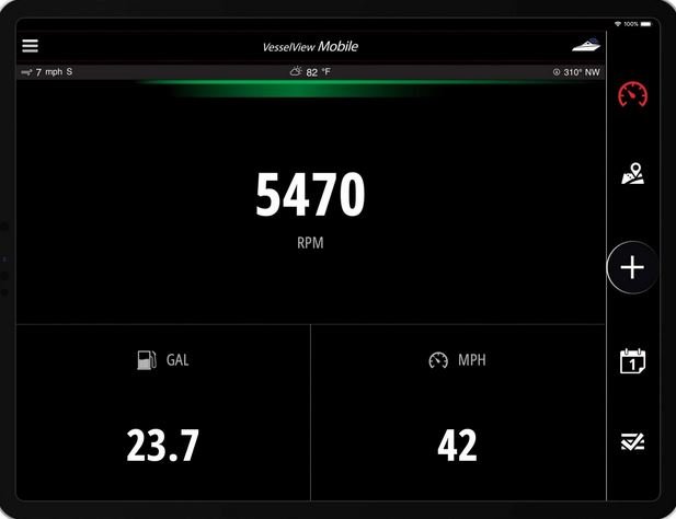 Stay alert through an on-board management system connected to your mobile device that displays VesselView® data on your device. VesselView® Mobile uses Bluetooth to display gauge information on your iPhone or Android, and allows you to monitor all engines and customize data points across three screens. Receive alerts if something isn't right with your engine to assist in troubleshooting and keep you on the water.