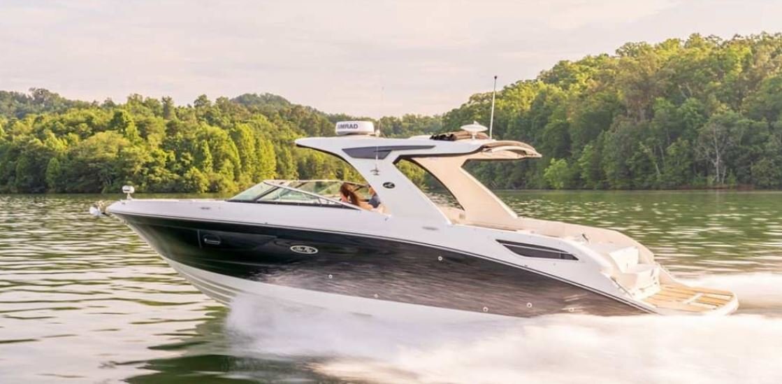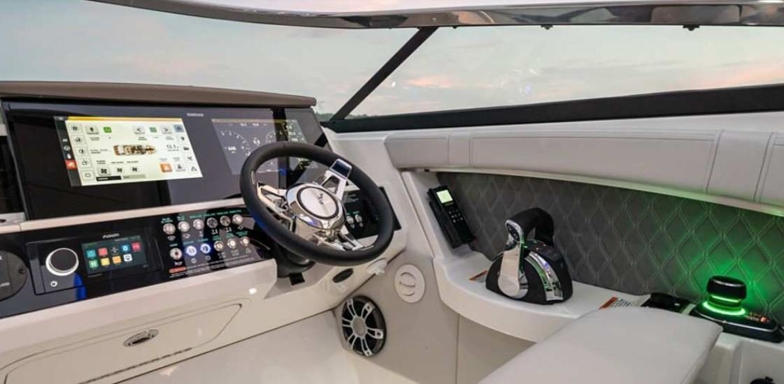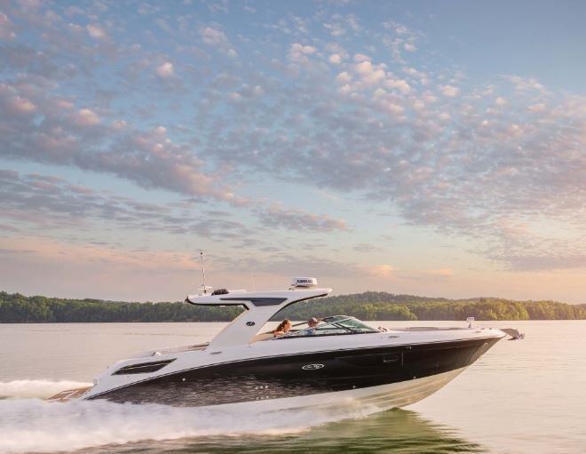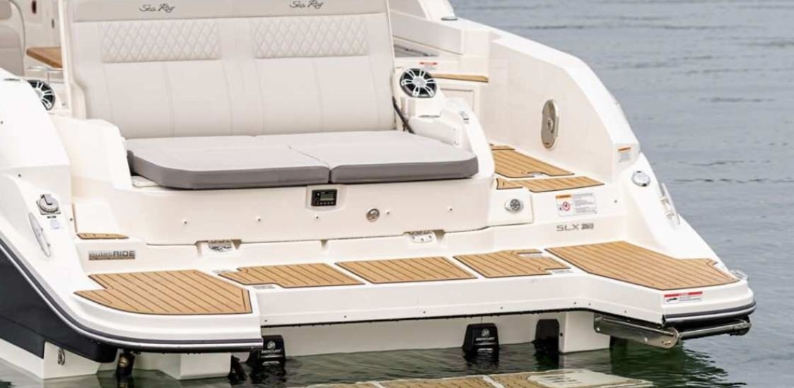 Sea Ray’s SLX 350 hosts an array of features designed for an excellent on-water experience and optimal performance. Powered by twin Mercury® MerCruiser® 6.2L engines, with a Joystick Piloting to ease maneuverability, the enhanced SLX 350 delivers a superior ride and unrivaled handling. NextWave™ innovations, such as quietRIDE™ technology, and optional Dynamic Running Surface™ further elevate the boating experience. The intuitive helm comes standard with dual 9-inch Simrad® SelectResponse GlassDash touchscreen information displays (12" optional), including Mercury VesselView® Link Data. Designed with families in mind, the Port Hideaway® provides an air-conditioned space with an expanded cabin and plush seating.