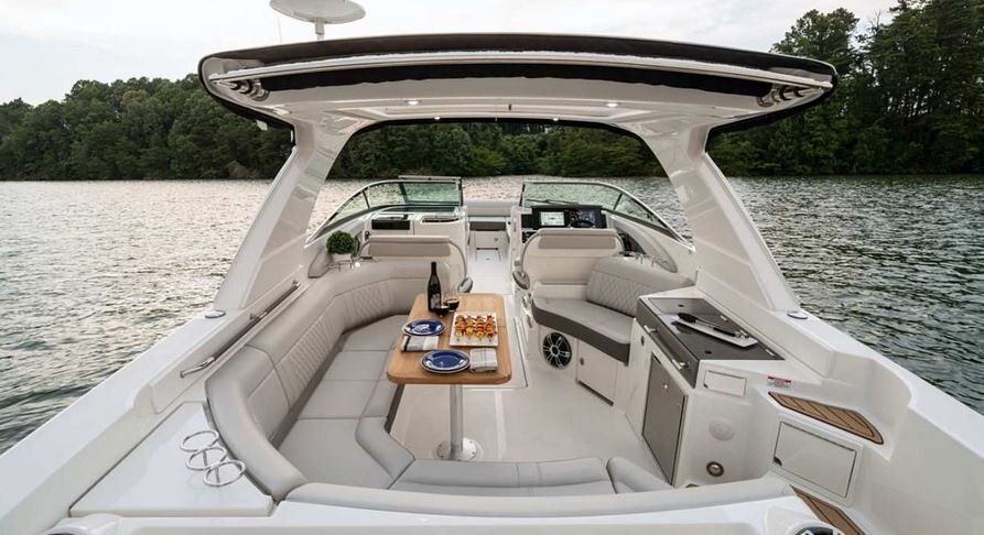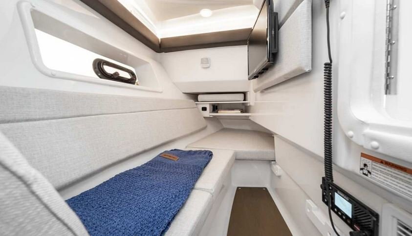 Retreat from the elements to relax with air conditioning, filler cushions, SeaDek flooring, and TV with input ports. This hideaway makes for a perfect day extender.