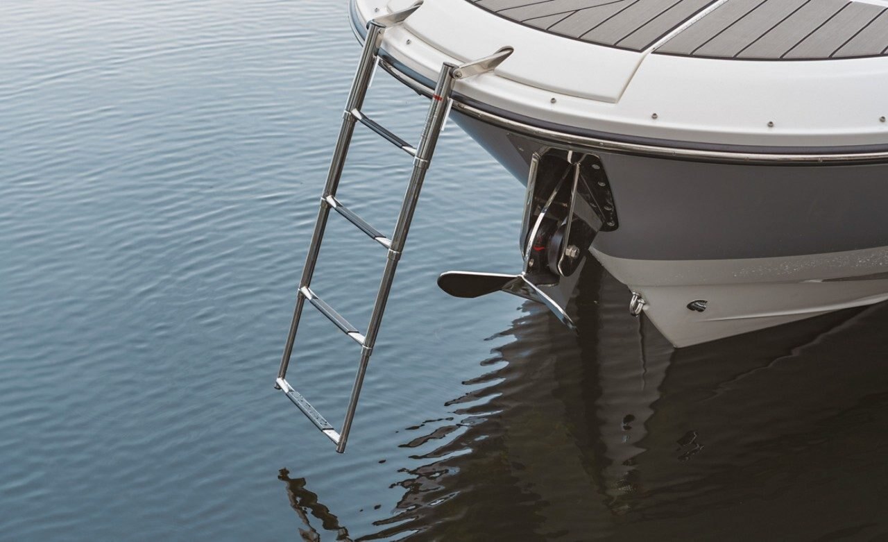 Move seamlessly between the deck and the water with transom-mounted, concealable ladder and optional submersible swim step for swimming and water sports off the back of the boat.