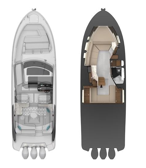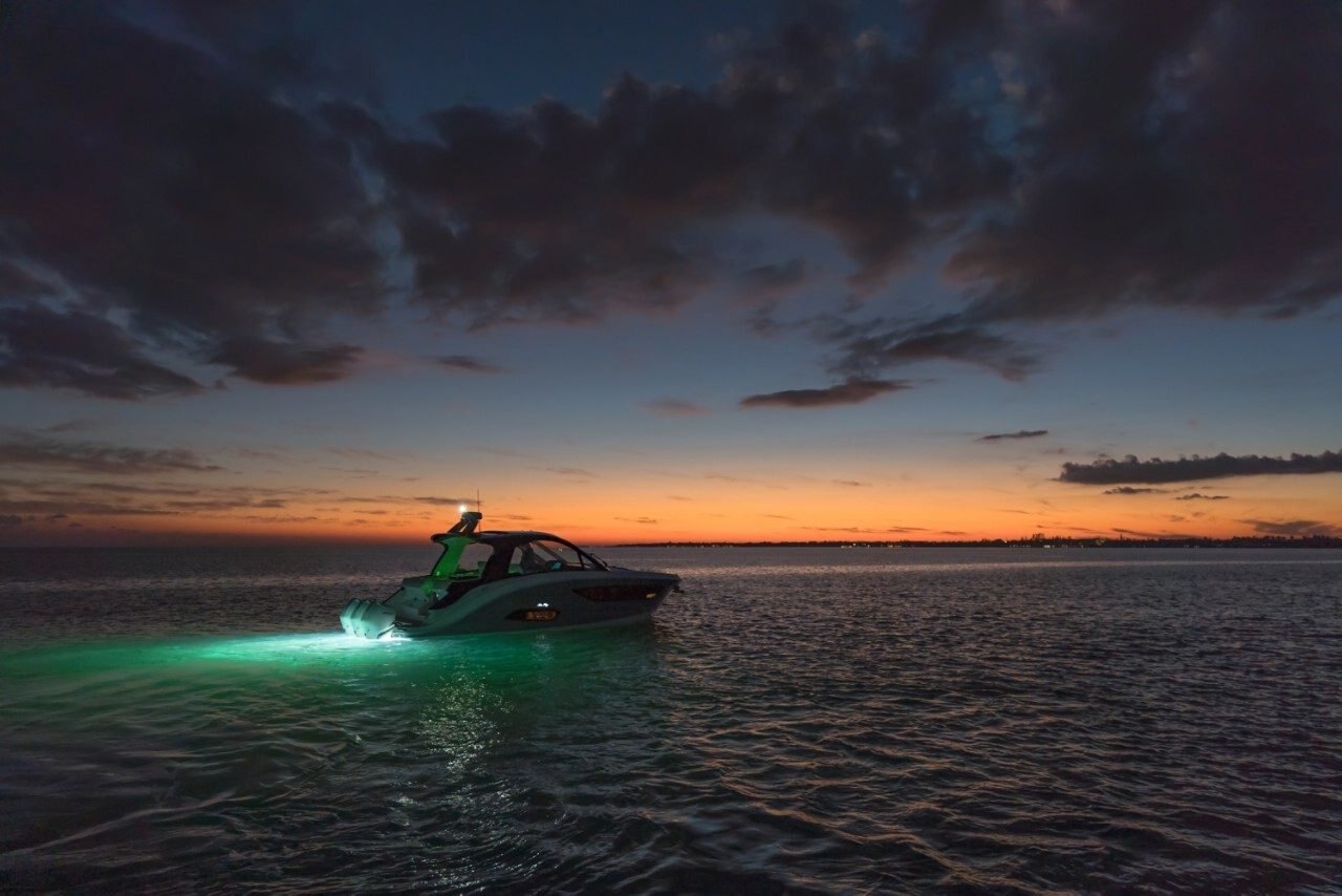 The Sundancer 370 Outboard is propelled by standard triple Mercury® 300 Verado® outboard engines with Joystick Piloting and optional Dynamic Running Surface™. Offering the latest in intelligent command, the helm is equipped with a Digital Dash™ featuring standard dual 12″ Simrad® GO12 touchscreen displays. It also includes CZone® digital switching providing full lighting control, an optional Seakeeper® 3 gyroscope stabilizer and an optional integrated premium audio system with Fusion® Apollo RA770.