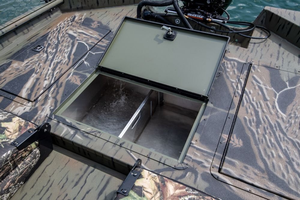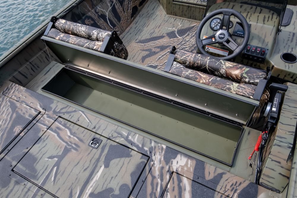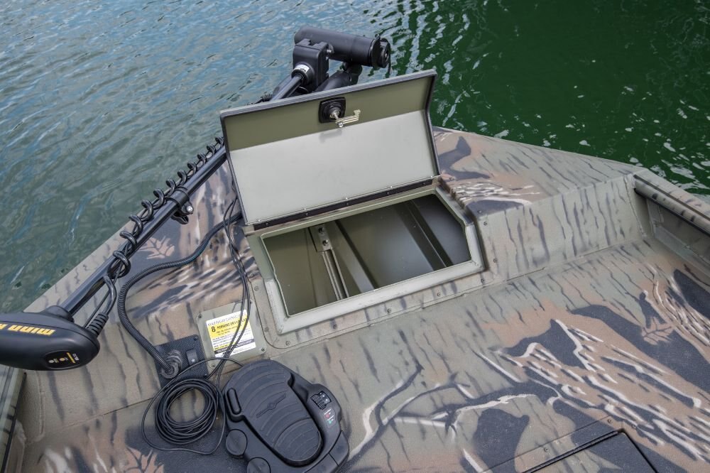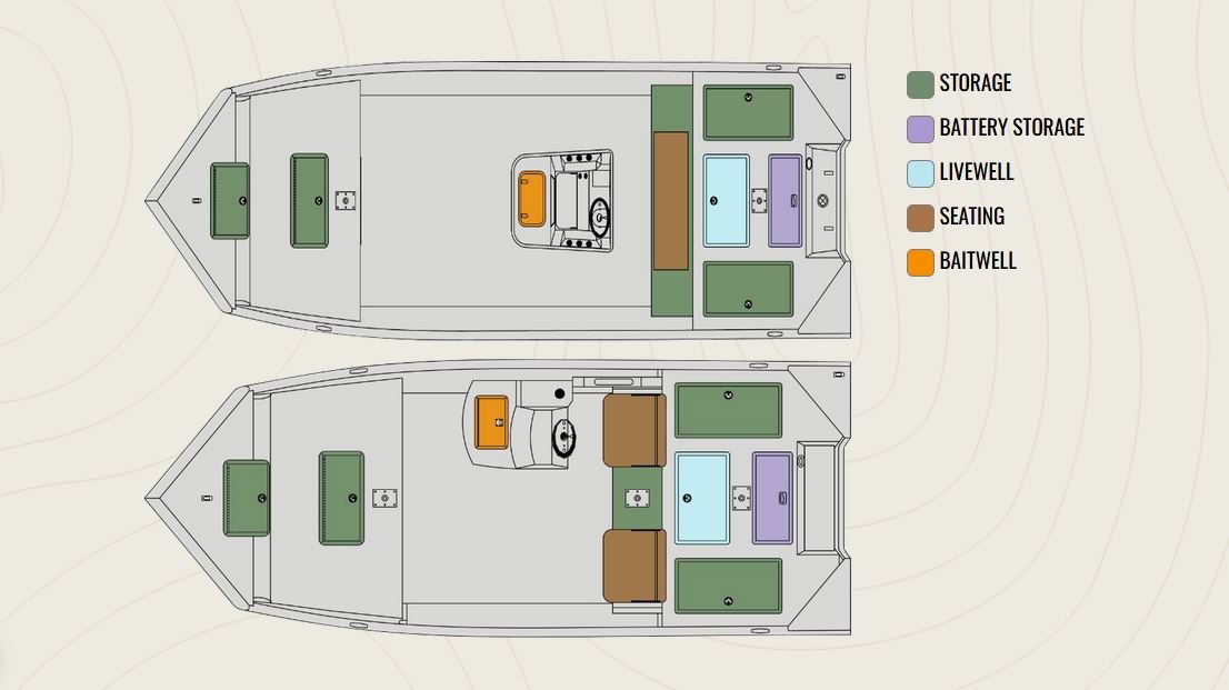 • 15° All-Welded V Hull • Standard Paint • .125 Gauge Treadplate Floor • Anchor Locker • LED Courtesy • LED Navigation Lights • Auto Bilge • 12 Volt Accessory Outlet with USB Port • Bow-Tilt Trim Switch • 2 Stainless Steel Base Plates • Oversized Extrude Caprail • Four Nylon Cleats • One Lockable Bow Storage Box • 60 G Aerated Livewell • Rear Seat Box w/Storage and Upholstered Seats • Rear Fishing Deck w/Two Dry Storage Boxes • Trolling Motor Wiring (6 gauge) • Aerated Baitwell • 4 Switch Panel • Transducer Bracket • Splashwell • Two-Fold Down Fishing Seats w/ Pedestals • Side Panels • FG Side Console (9.5 G Aerated Livewell) w/ (2) 24” Bench Seats w/ cushion or • FG Center Console (15 G Aerated Livewell) w/ (1) 48” Bench Seats w/ cushion • Three Battery Trays • 28 G Belly Fuel Tank • NMMA Certified • 5052 Aluminum • All Aluminum Floors and Decks • Flotation Pods • Gator-Hide • Tilt Helm • Fuel Gauge • Stainless Steel Bow and Stern Eyes |